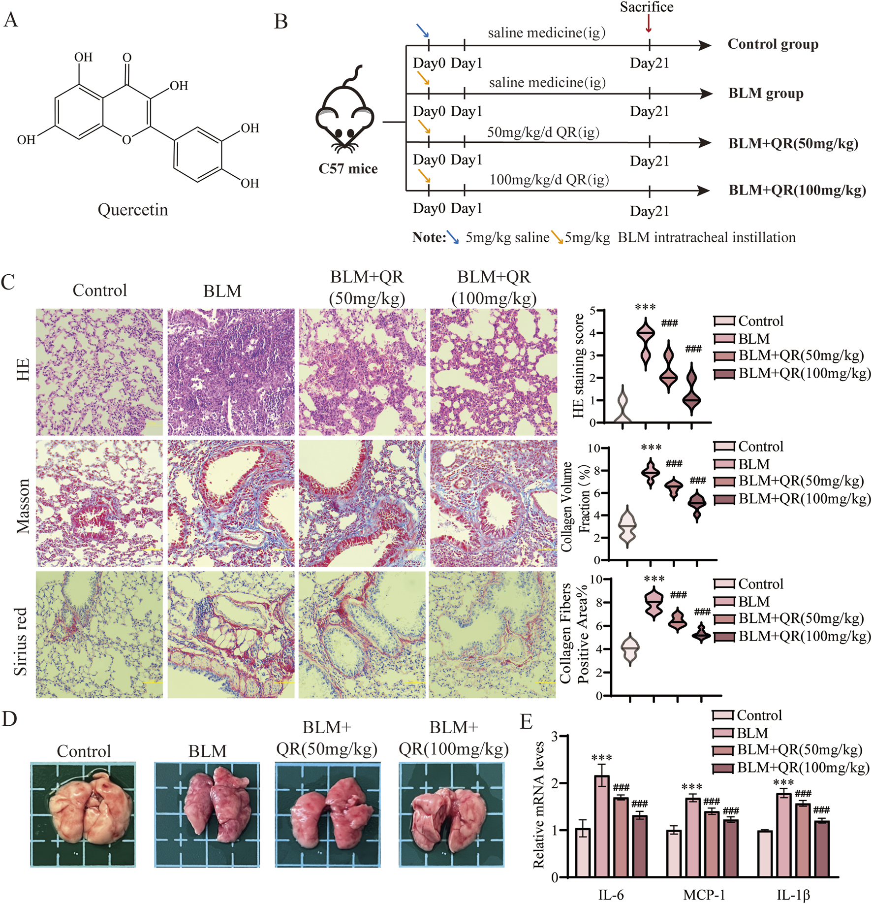 Quercetin alleviates BLM-induced pulmonary fibrosis and inflammation in pulmonary fibrosis mouse model. (A) The molecular formula of quercetin. (B) Schematic representation of the animal experimental model. (C) Representative images of H&E, Masson, and Sirius Red staining in lung tissue from four groups, along with quantitative analysis of H&E, Masson, and Sirius Red staining (n = 6). (D) Lung image plots. (E) Real-time qPCR analysis of mRNA expression, relative levels of IL-6, IL-1β, and MCP-1 (n = 3). Data are presented as means ± SEM; *P < 0.05, **P < 0.01, and ***P < 0.001 compared to the control group; #P < 0.05,##P < 0.01, and ###P < 0.001 compared with the BLM group. Abbreviations: BLM, Bleomycin; H&E, Hematoxylin and Eosin; IL-6, Interleukin-6; IL-1β, Interleukin-1β; QR, Quercetin. Ig, Intragastric Administration; MCP-1, Monocyte Chemoattractant Protein-1.