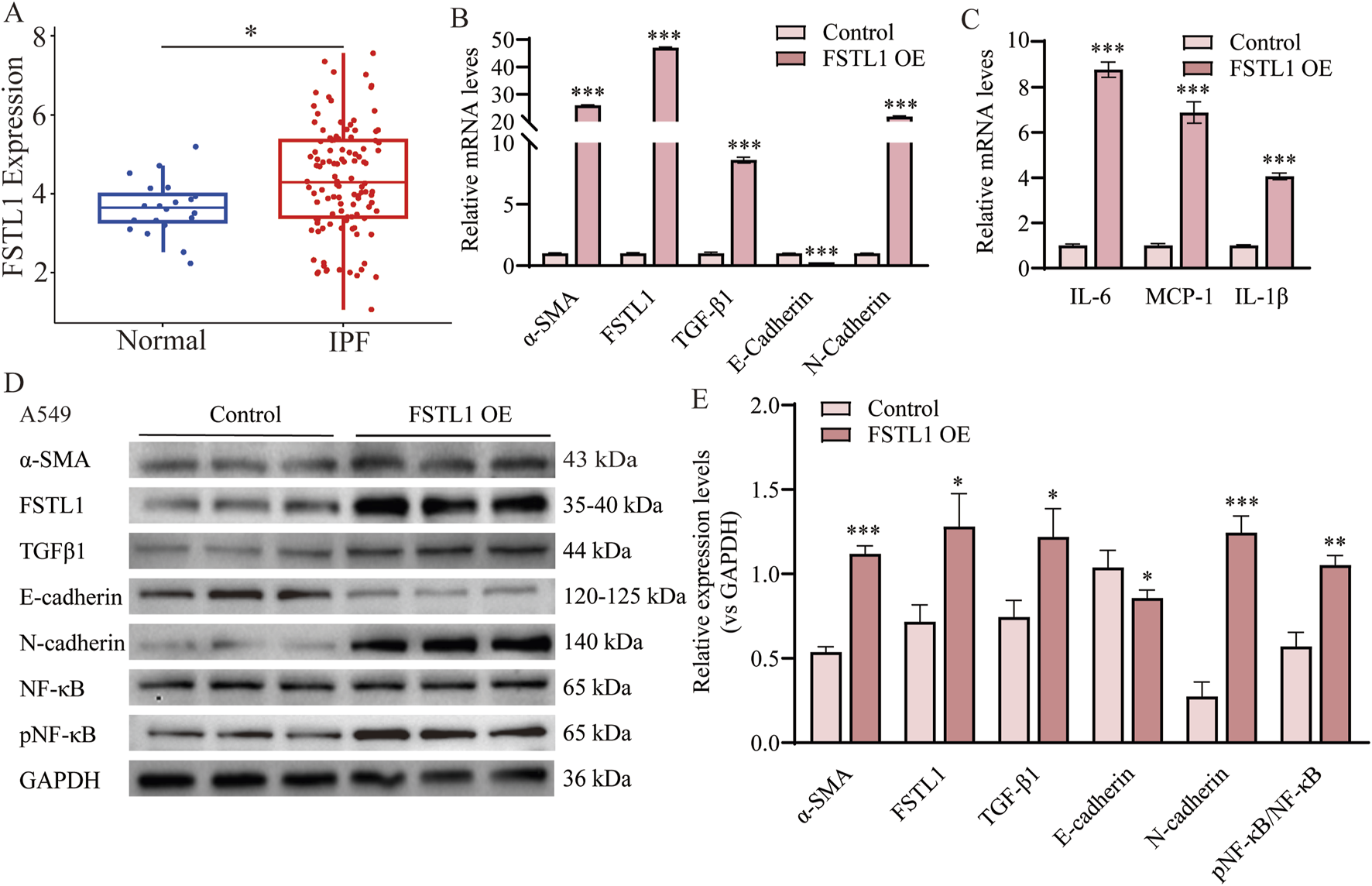 Overexpression of FSTL1 induces TGF-β1 expression and EMT in A549 cells. (A) Analysis of FSTL1 mRNA expression in bronchoalveolar lavage fluid from patients with idiopathic pulmonary fibrosis using the GSE70866 dataset from the GEO database. (B) Real-time qPCR analysis of mRNA expression, relative levels of α-SMA, FSTL1, TGF-β1, E-cadherin, and N-cadherin (n = 3). (C) Real-time qPCR analysis of mRNA expression, relative levels of IL-6, IL-1β, and MCP-1 (n = 3). (D) Protein expression levels of α-SMA, FSTL1, TGF-β1, E-cadherin, N-cadherin, total NF-κB, and phosphorylated NF-κB were determined using Western blotting. (E) Quantitative analysis of α-SMA, FSTL1, TGF-β1, E-cadherin, N-cadherin, total NF-κB, and phosphorylated NF-κB proteins was performed, with GAPDH as a loading control (n = 3). Data are presented as means ± SEM; *P < 0.05, **P < 0.01, and ***P < 0.001 compared with the control group. Abbreviations: IPF, idiopathic pulmonary fibrosis; FSTL1 OE, FSTL1 overexpression; TGF-β1, Transforming Growth Factor Beta 1; FSTL1, Follistatin-like 1; NF-κB, Nuclear Factor Kappa B; α-SMA, Alpha-Smooth Muscle Actin; IL-6, Interleukin-6; IL-1β, Interleukin-1β; pNF-κB, phosphorylated Nuclear Factor kappa-B; GAPDH, Glyceraldehyde-3-Phosphate Dehydrogenase; MCP-1, Monocyte Chemoattractant Protein-1.