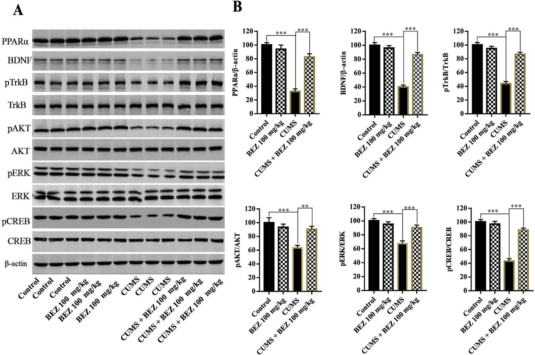 Figure 2. BEZ administration promotes the expression levels of the hippocampal PPARα and BDNF signaling pathway in CUMS-induced mice. (A) The expression levels of PPARα, BDNF, pTrkB, TrkB, pAKT, AKT, pERK, ERK, pCREB, and CREB were quantified by Western blot analysis. (B) The statistical analysis of protein levels. **P < 0.01, ***P < 0.001, n = 5 biological replicates.
