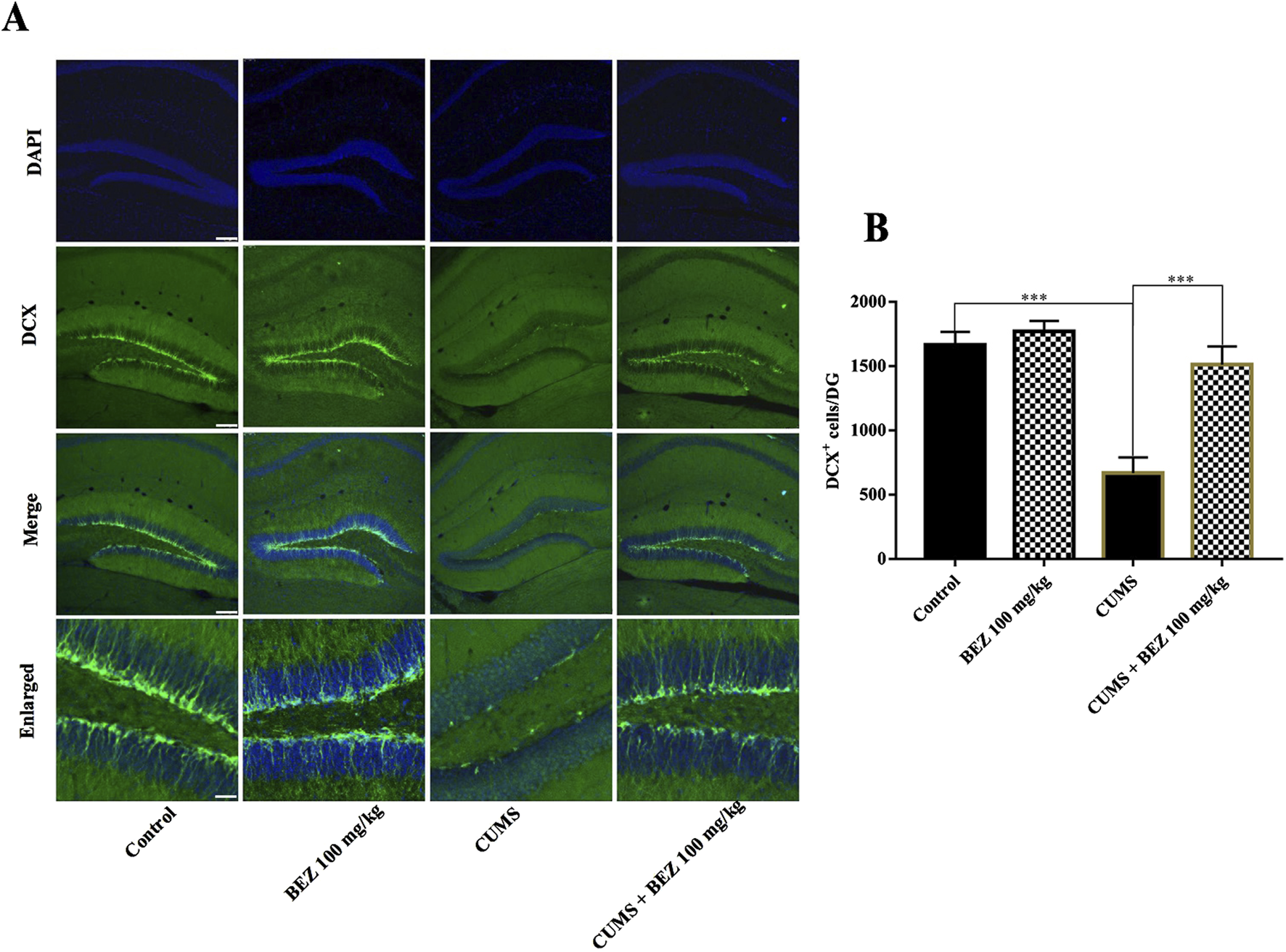 Figure 3. BEZ treatment promotes hippocampal neurogenesis in the CUMS-induced mice. (A) Immunofluorescent staining of DCX in the DG region, Scale bar = 150 μm. (B) Representative images of confocal microscopy and corresponding analyses of the number of DCX positive cells in the DG region. ***P < 0.001, n = 5 biological replicates.