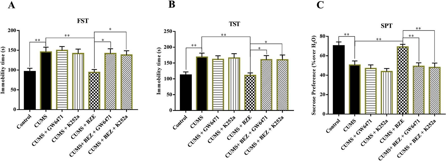 Figure 4. Blockade of the PPARα and BDNF signaling pathway by GW6471 and K252a abolished the antidepressant efficacy of BEZ in mice. (A) Mice in the (CUMS + BEZ + GW6471)-treated and (CUMS + BEZ + K252a)-treated group spent significantly more time being immobile than mice in the (CUMS + BEZ)-treated groups in the FST. (B) Mice in the (CUMS + BEZ + GW6471)-treated and (CUMS + BEZ + K252a)-treated group spent significantly more time being immobile than mice in the (CUMS + BEZ)-treated groups in the TST. (C) Mice in the (CUMS + BEZ + GW6471)-treated group and (CUMS + BEZ + K252a)-treated group displayed notably lower sucrose preference than mice in the (CUMS + BEZ)-treated group. *P < 0.05, **P < 0.01, n = 10 biological replicates.