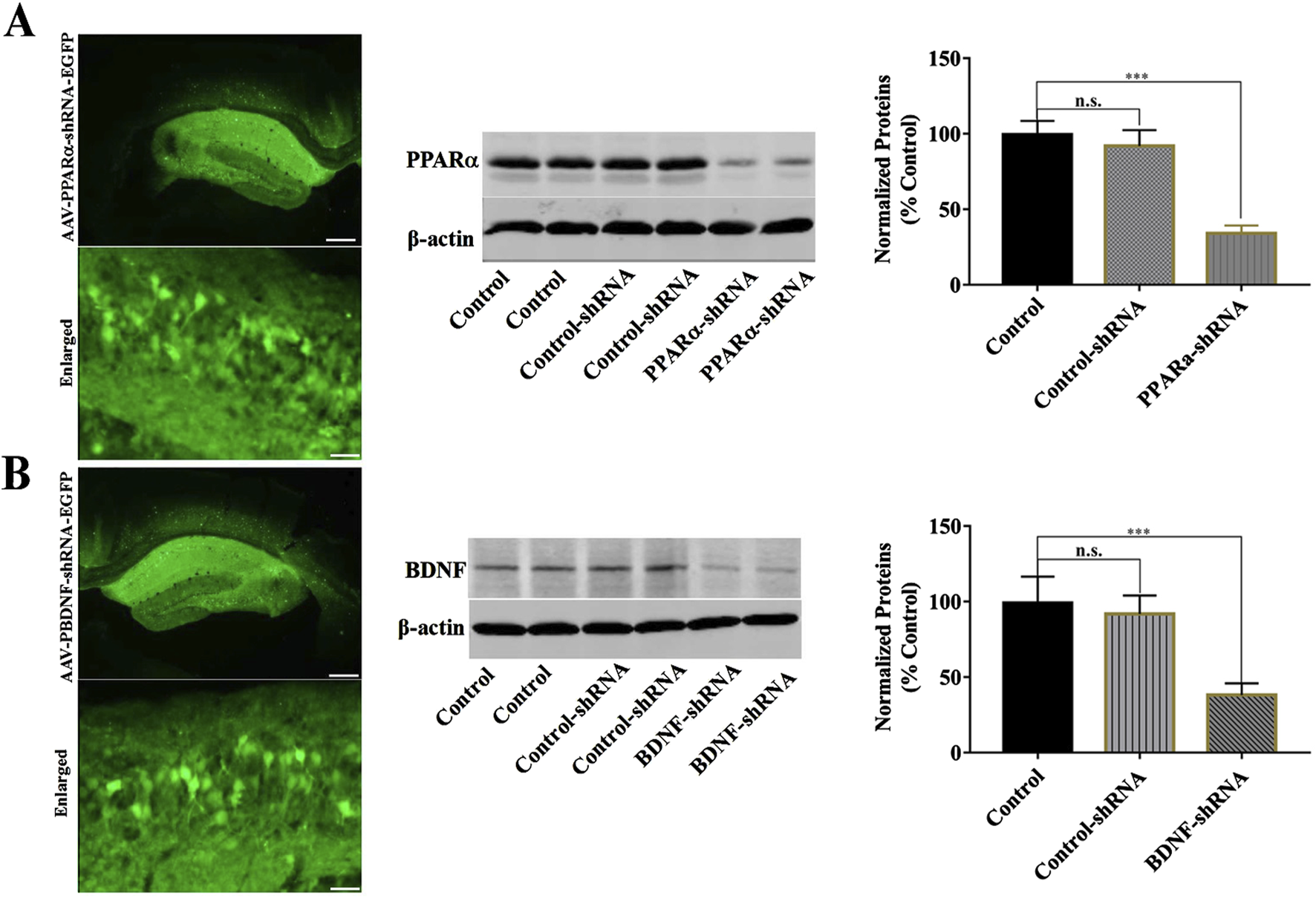 Figure 5. Hippocampal PPARα-knockdown by PPARα-shRNA and BDNF-knockdown by BDNF-shRNA. (A) Fluorescence images of a fixed hippocampal slice which expressed AAV-PPARα-shRNA-EGFP 2 weeks after its stereotactic infusion. The scale bars of representative and enlarged images are 400 and 50 μm, respectively. The following Western blotting results confirmed the silencing effects of PPARα-shRNA on the protein expression of hippocampal PPARα. ***P < 0.001, n = 5 biological replicates. (B) Fluorescence images of a fixed hippocampal slice which expressed AAV-BDNF-shRNA-EGFP 2 weeks after its stereotactic infusion. The scale bars of representative and enlarged images are 400 and 50 μm, respectively. The following Western blotting results confirmed the silencing effects of BDNF-shRNA on the protein expression of hippocampal BDNF. ***P < 0.001, n = 5 biological replicates.