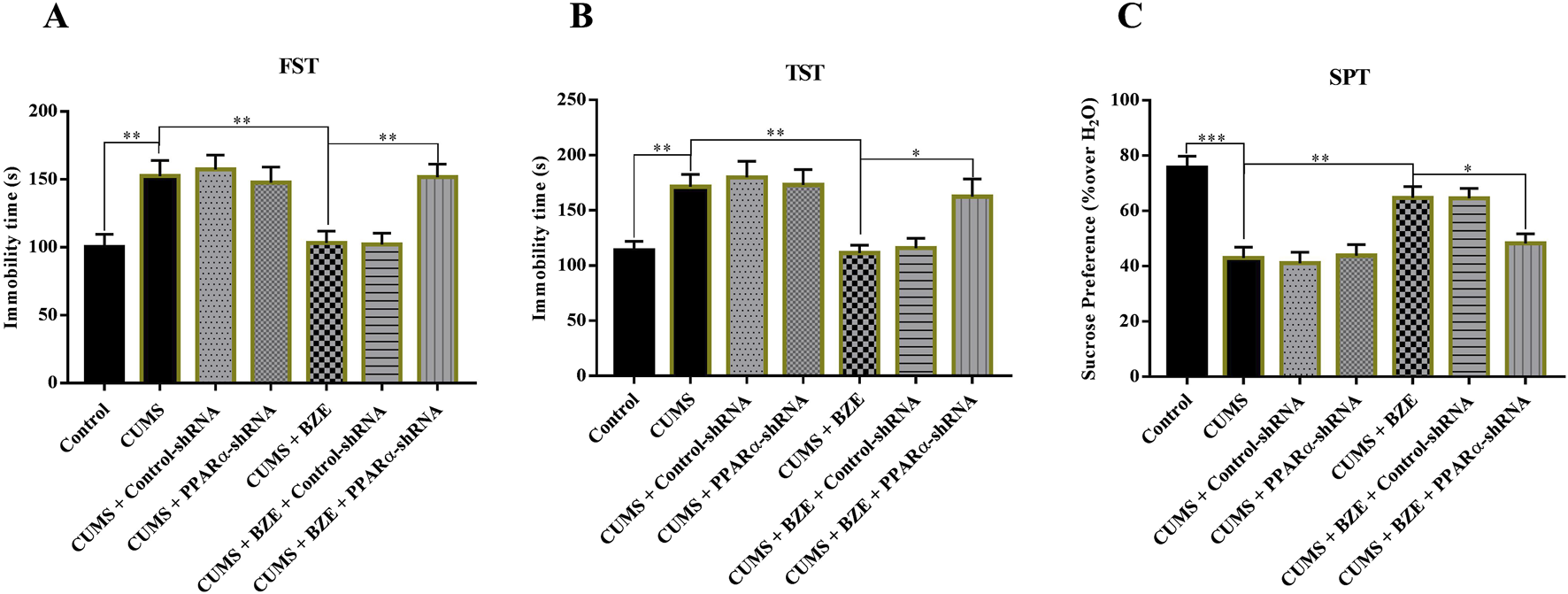 Figure 6. Hippocampal PPARα-knockdown by PPARα-shRNA abolished the antidepressant activity of BEZ in mice. (A) Mice in the (CUMS + BEZ + BDNF-shRNA)-treated group spent significantly more time being immobile than mice in the (CUMS + BEZ)-treated and (CUMS + BEZ + control-shRNA)-treated groups in the FST. (B) Mice in the (CUMS + BEZ + PPARα-shRNA)-treated group spent significantly more time being immobile than mice in the (CUMS + BEZ)-treated and (CUMS + BEZ + control-shRNA)-treated groups in the TST. (C) Mice in the (CUMS + BEZ + PPARα-shRNA)-treated displayed notably lower sucrose preference than mice in the (CUMS + BEZ)-treated and (CUMS + BEZ + control-shRNA)-treated groups. *P < 0.05, **P < 0.01, n = 10 biological replicates.
