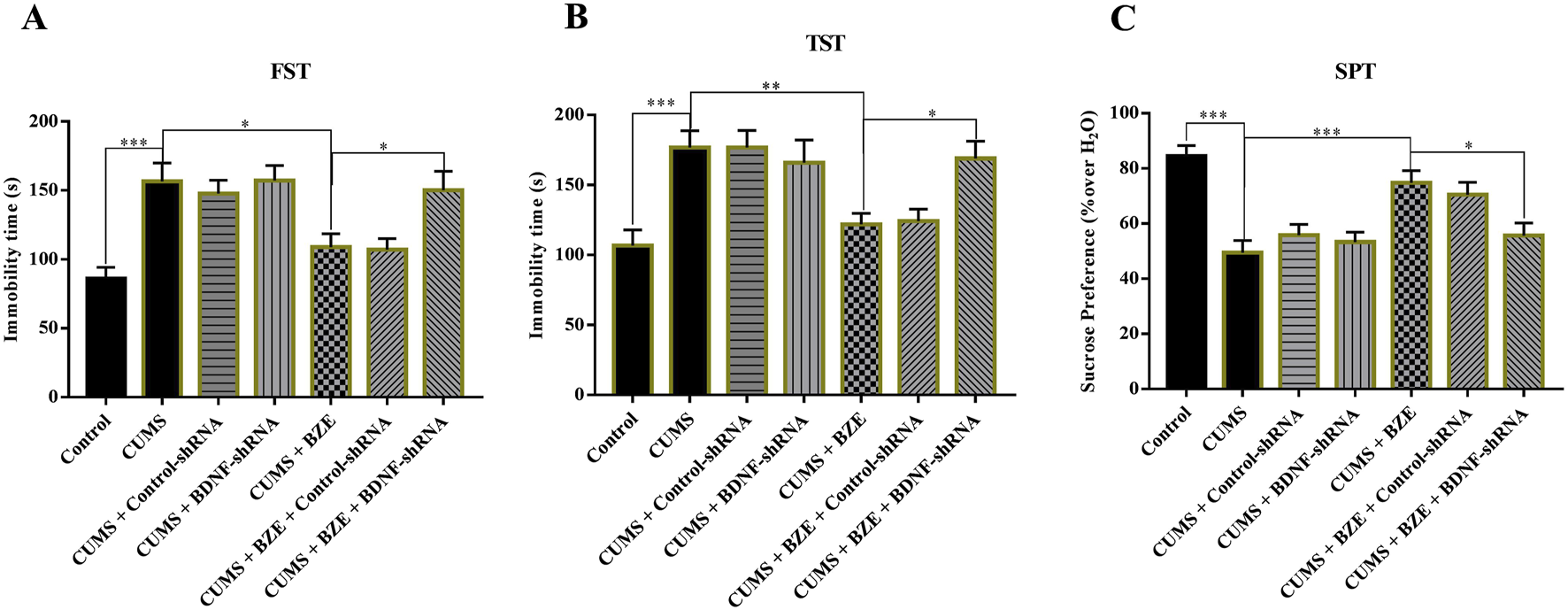 Figure 7. Hippocampal BDNF-knockdown by BDNF-shRNA abolished the antidepressant activity of BEZ in mice. (A) Mice in the (CUMS + BEZ + BDNF-shRNA)-treated group spent significantly more time being immobile than mice in the (CUMS + BEZ)-treated and (CUMS + BEZ + control-shRNA)-treated groups in the FST. (B) Mice in the (CUMS + BEZ + BDNF-shRNA)-treated group spent significantly more time being immobile than mice in the (CUMS + BEZ)-treated and (CUMS + BEZ + control-shRNA)-treated groups in the TST. (C) Mice in the (CUMS + BEZ + BDNF-shRNA)-treated displayed notably lower sucrose preference than mice in the (CUMS + BEZ)-treated and (CUMS + BEZ + control-shRNA)-treated groups. *P < 0.05, **P < 0.01, n = 10 biological replicates.