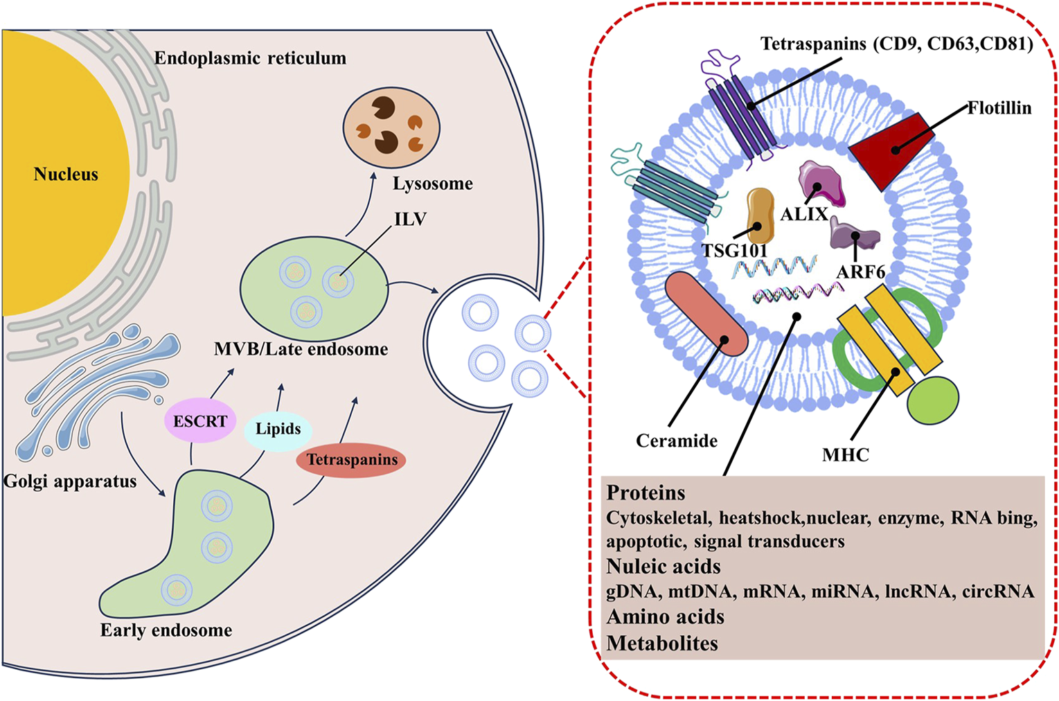 The biogenesis and secretion of exosome are complex processes, involving double invagination of the plasma membrane, and subsequent fusion of multivesicular bodies (MVBs) containing intraluminal vesicles (ILVs) (Kalluri and LeBleu, 2020; Han et al., 2022). These start with the inward membrane budding of early sorting endosomes (ESEs) with the help of the trans-Golgi network (Teng and Fussenegger, 2021). The ESEs then mature into late-sorting endosomes (LSEs) and eventually generate MVBs by the inward budding of the endosomal membrane. Finally, ILVs are ultimately secreted as exosomes through MVBs fusion with the plasma membrane or lysosomes, or autophagosomes for degradation (Théry et al., 2002; Arya et al., 2024). It is well known that exosomes can be generated by endosomal sorting complexes required for transport (ESCRT)-dependent or ESCRT-independent pathways (Juan and Fürthauer, 2018; Wei et al., 2021). The ESCRT machinery primarily includes four complexes (named ESCRT-0, ESCRT-I, ESCRT-II, ESCRT-III) and some accessory components such as apoptosis-linked gene 2-interacting protein X (ALIX), syntenin, and vacuolar protein sorting 32 (VPS32) (Baietti et al., 2012; Larios et al., 2020; Salas et al., 2022). Exosomes can also be generated through ESCRT-independent pathways. Those protein similar to the lipid raft microdomains, including phospholipids, tetraspanins, ceramides, and neutral sphingomyelinases (nSMases), have been expounded to participate in exosome biogenesis through additional pathways (Trajkovic et al., 2008; Van Niel et al., 2011; Niekamp et al., 2022) (Figure 1).