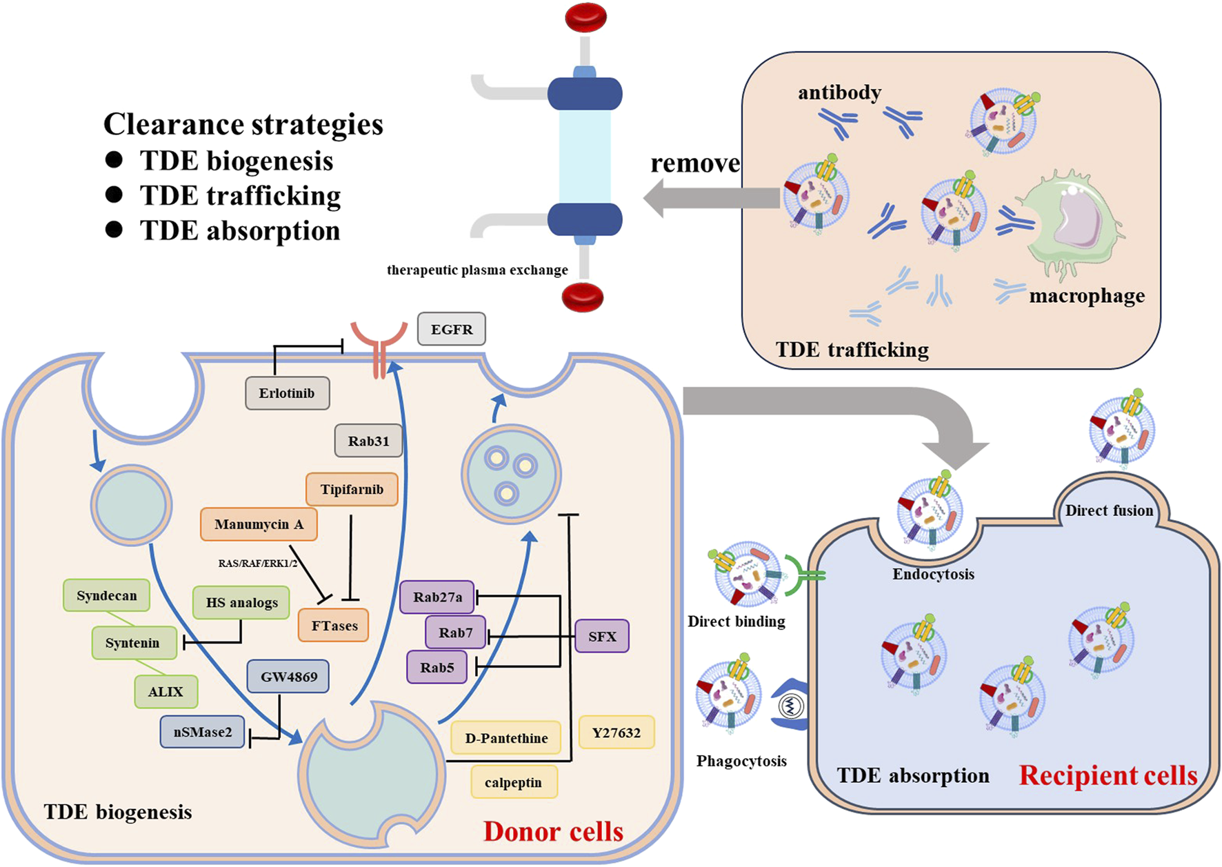 In addition to the antibodies, the removal of TDEs from the circulation through therapeutic plasma exchange (TPE) is another promising approach (Orme et al., 2020). The plasma from patients was extracted by apheresis equipment and replaced by colloid solutions to discard the circulating exosomes. However, due to the disadvantages with high cost and high invasiveness significantly limited its clinical translation. Moreover, interfering with exosome-driven signaling in recipient cells can potentially relieve exosome-mediated intercellular communication and further inhabit exosome mediated tumor promoting effect. Selective inhibition of PI3K signaling by wortmannin and LY294002 reduced the TDEs uptake by macrophages in a dose-dependent manner (Fitzner et al., 2011). Cytochalasin D and Latrunculin A, actin polymerization inhibitors, required for cytoskeletal remodeling, blocked the TDEs adsorption by human umbilical vein endothelial cells (HUVECs) (Svensson et al., 2013). Despite significant efforts to impede the transport of TDEs, achieving specificity remains a challenge due to the heterogeneity of these vesicles. More efforts to target and eliminate patients’ specific TDEs biomarkers are still needed.