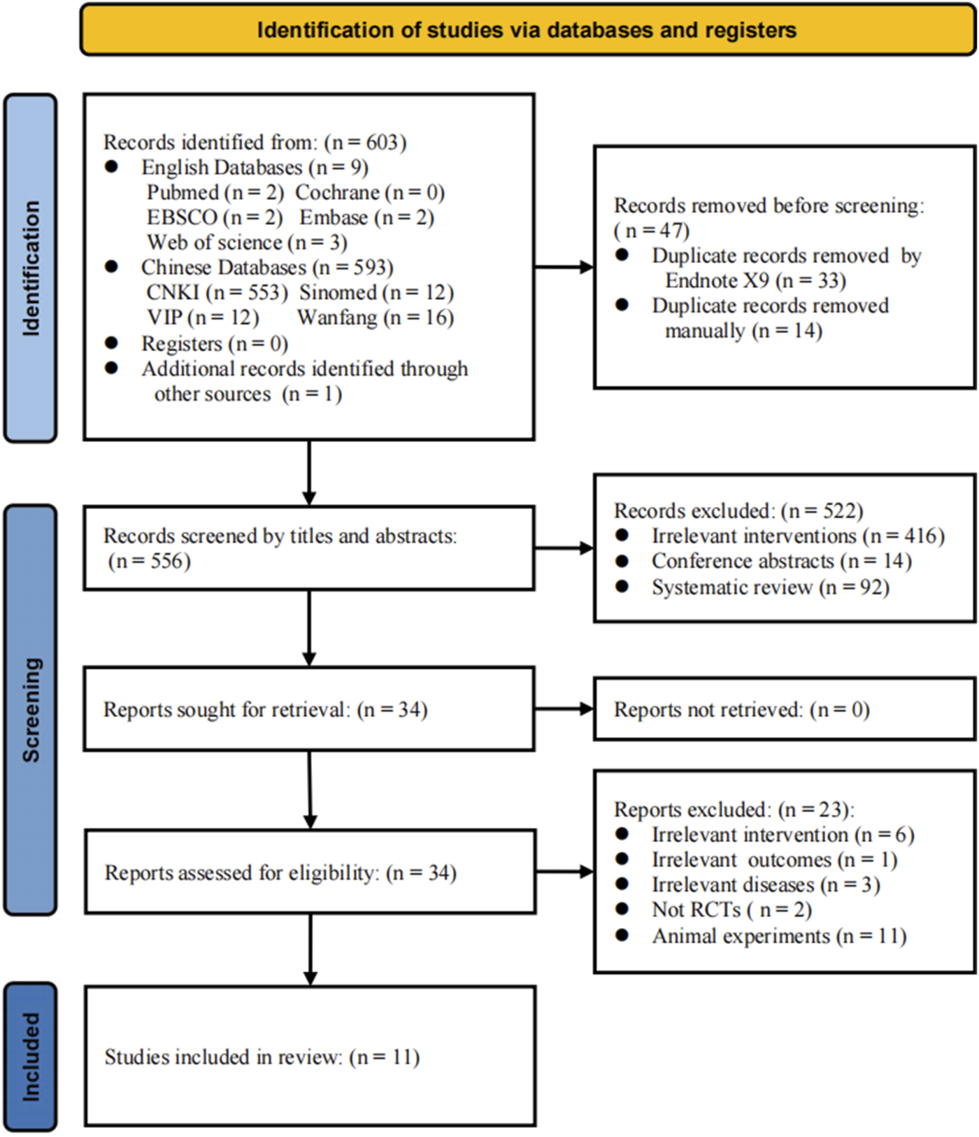 A total of 603 relevant articles were imported into EndNote X9. Using the “find duplicates” feature, 33 duplicate records were automatically removed, with an additional 14 eliminated through manual screening. Among the remaining 556 articles, a review of titles and abstracts resulted in the exclusion of 522 studies, including 416 that did not meet the experimental requirements, interventions, or methods, 92 review articles, and 14 conference abstracts. A full-text review of the remaining 34 articles led to further exclusions: 6 for non-compliance with control principles, 1 for not meeting outcome criteria, 3 for non-compliance with diagnostic standards, 2 for not being RCTs, and 11 for being animal studies (Figure 1). Ultimately, 11 studies were included in the meta-analysis (Bai et al., 2017; Zhang et al., 2017; Ma et al., 2018; Dong, 2019; He et al., 2019; Liu et al., 2019; Liu, 2020; Ma et al., 2020; Pang et al., 2021; Niu and Zhu, 2022; Ma et al., 2024). Detailed flowchart of literature search and study selection is shown in Figure 1.