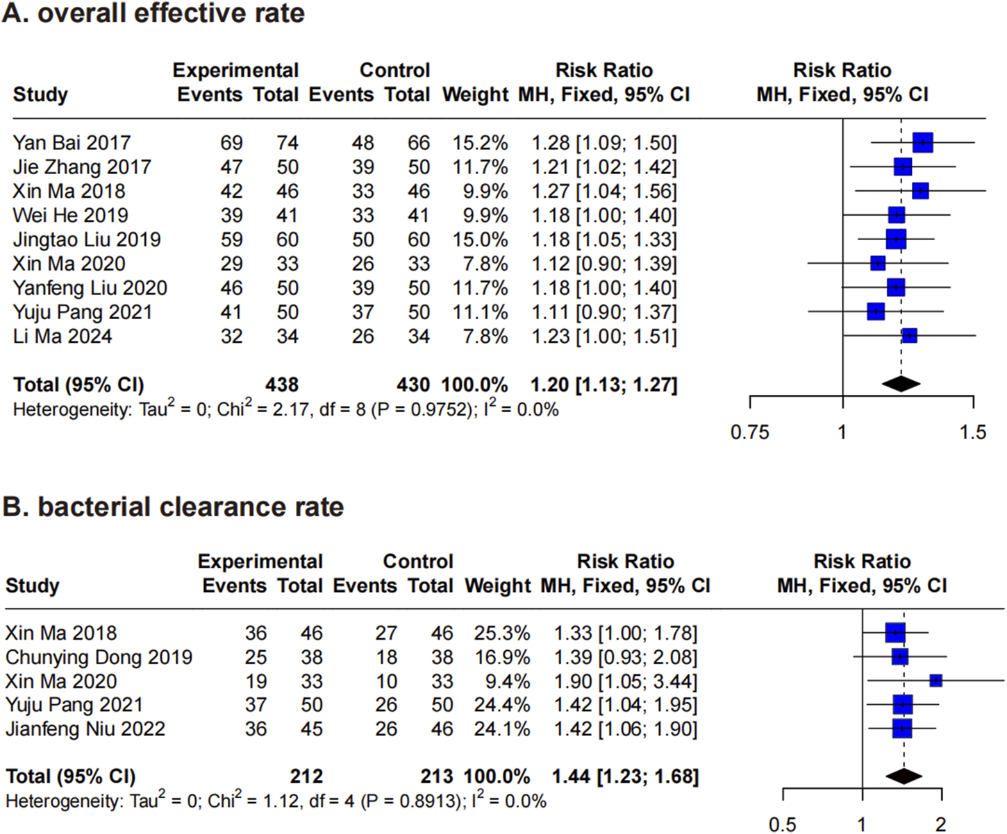 Forest plots for primary outcomes. Forest plots illustrates the effects of XBJ compared to the control group on (A) overall effective rate and (B) bacterial clearance rate in A. baumannii infection.