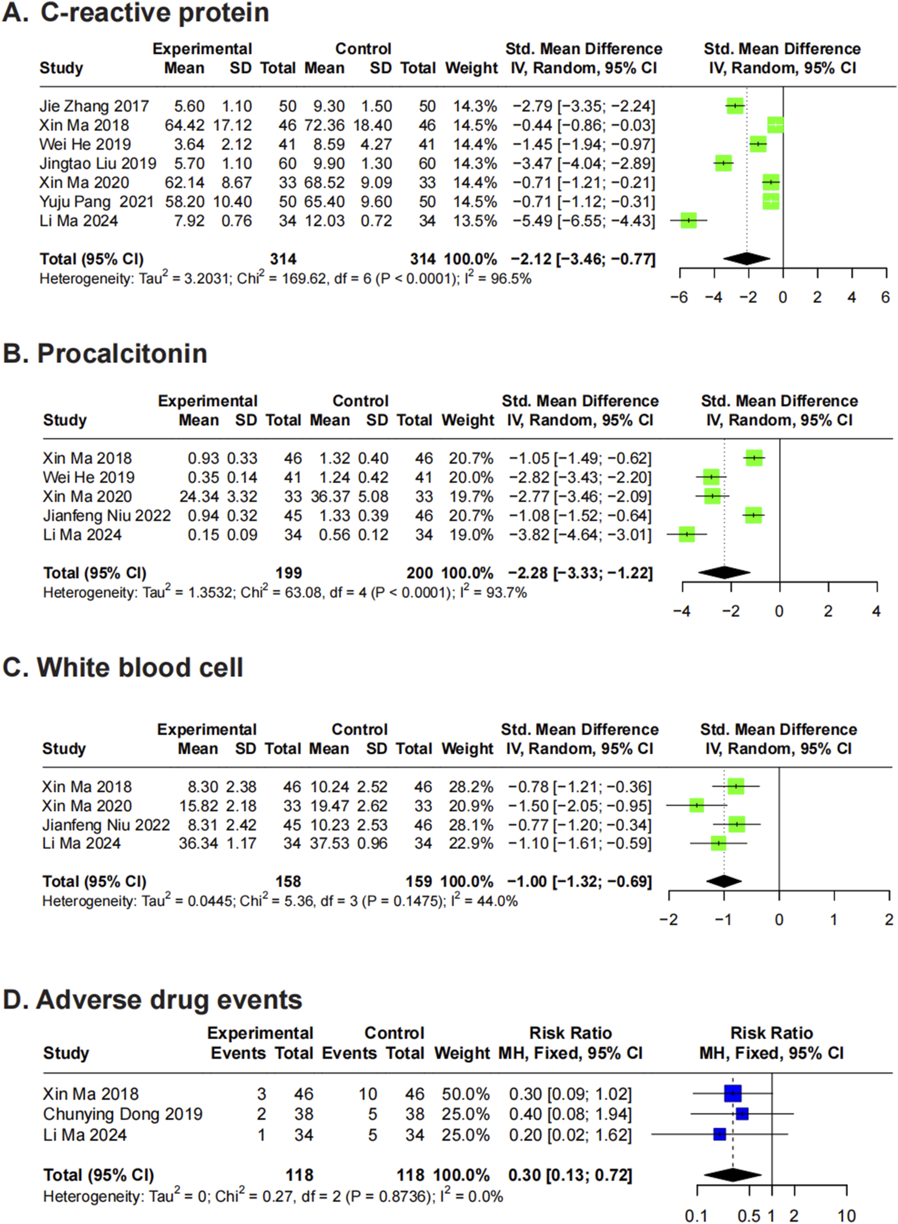 Forest plots for secondary outcomes. Forest plots illustrates the effects of XBJ compared to the control group on (A) C-reactive protein, (B) procalcitonin, (C) white blood cell and (D) adverse drug events in A. baumannii infection.