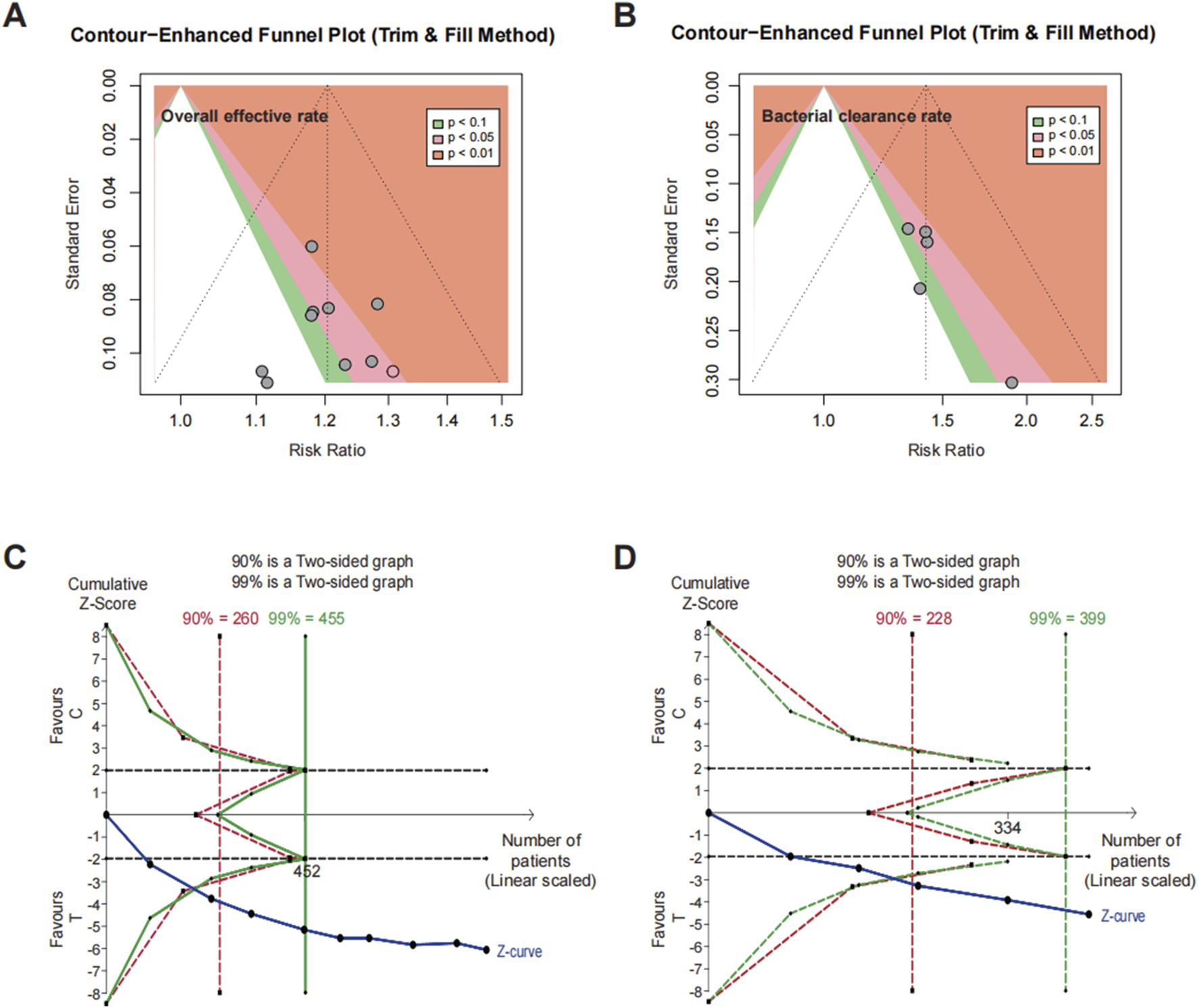 Publication bias and trial sequential analysis. Trim-and-fill funnel plots for (A) overall effective rate and (B) bacterial clearance rate. Trial sequential analysis for (C) overall effective rate and (D) bacterial clearance rate.
