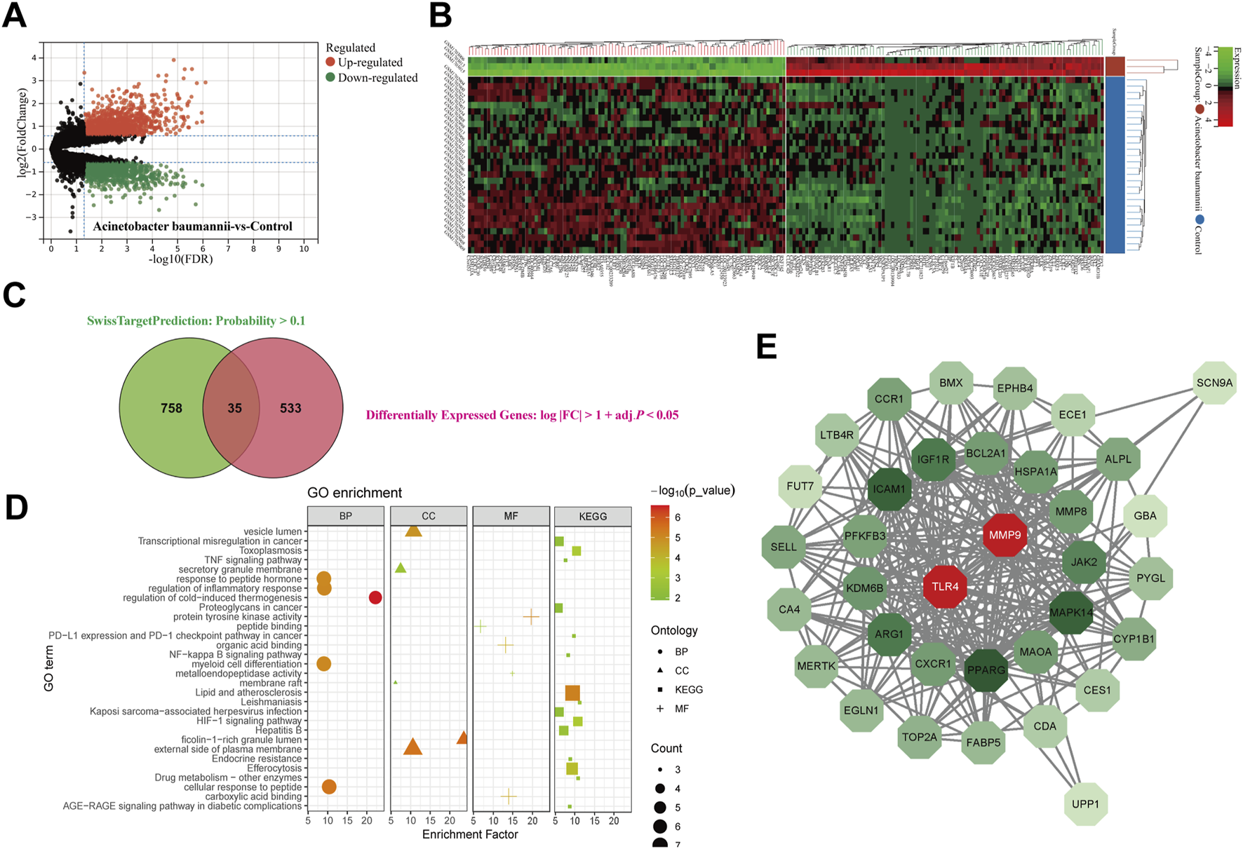 The bioactive ingredients of XBJ were identified through previous published mass spectrometry-based studies (Huang et al., 2011; Jiang et al., 2013; Sun et al., 2017; Zuo et al., 2017a; Zuo et al., 2017b; Zuo et al., 2019; Yu et al., 2022; Li et al., 2023), and subsequently analyzed using SwissTargetPrediction (Daina et al., 2019) to predict associated protein targets of XBJ ingredients. A. baumannii-related genes were retrieved from the GEO dataset GSE69528 (Pankla et al., 2009) and reanalyzed with the limma package in R to identify differentially expressed genes (DEGs). The intersection of predicted protein targets of XBJ ingredients and A. baumannii-related genes was visualized using a Venn diagram. To explore molecular interactions, the Search Tool for the Retrieval of Interacting Genes/Proteins (STRING) database (https://cn.string-db.org/) and Cytoscape (version 3.10.1) were employed to construct the protein-protein interaction (PPI) network. The “analyze network” function in Cytoscape was applied to score the network, with the two nodes exhibiting the highest degree selected as key targets.