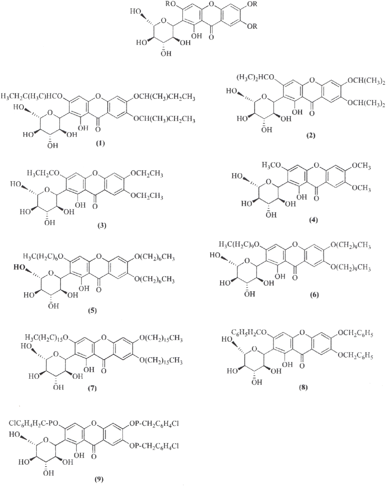 MF contains two hydroxylated aromatic rings, with four hydroxyl groups located on carbons 1, 3, 6, and 7; a xanthone ring, which includes a carbonyl group, and a glucose moiety (pyranose group) attached to carbon 2 (Figure 1). Consequently, the hydroxyl groups on C3, C6, and C7 are the primary target sites for synthesizing MF derivatives. Some substitution reactions may involve the hydrogen atom on C8, as well as C-C enzymatic cleavage at C2. The hydroxyl group on carbon atom C1 is hindered by steric effects from the pyranosyl group and forms an intramolecular hydrogen bond with the adjacent carbonyl group (Gómez-Zaleta et al., 2006). However, in a strongly basic medium, it may be possible to bond the oxygen atom of the C1-hydroxyl group.