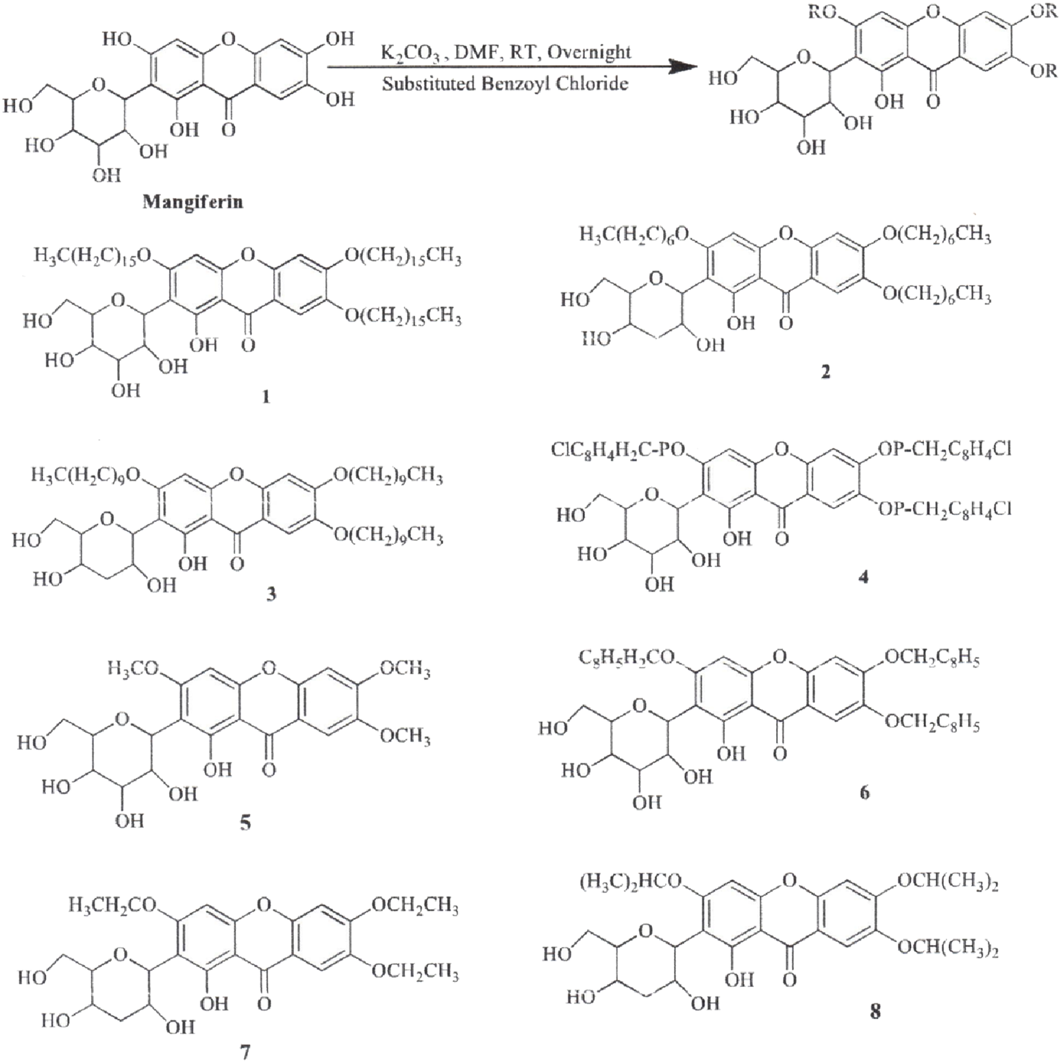 Chemical derivatives to enhance the mangiferin (MF) analgesic activity by inhibiting the cyclooxygenase enzyme. Reaction conditions: DMF as solvent, K2CO3, stirring overnight, room temperature. MF and all its derivatives had similar analgesic and anti-inflammatory effects (Turkar et al., 2024).