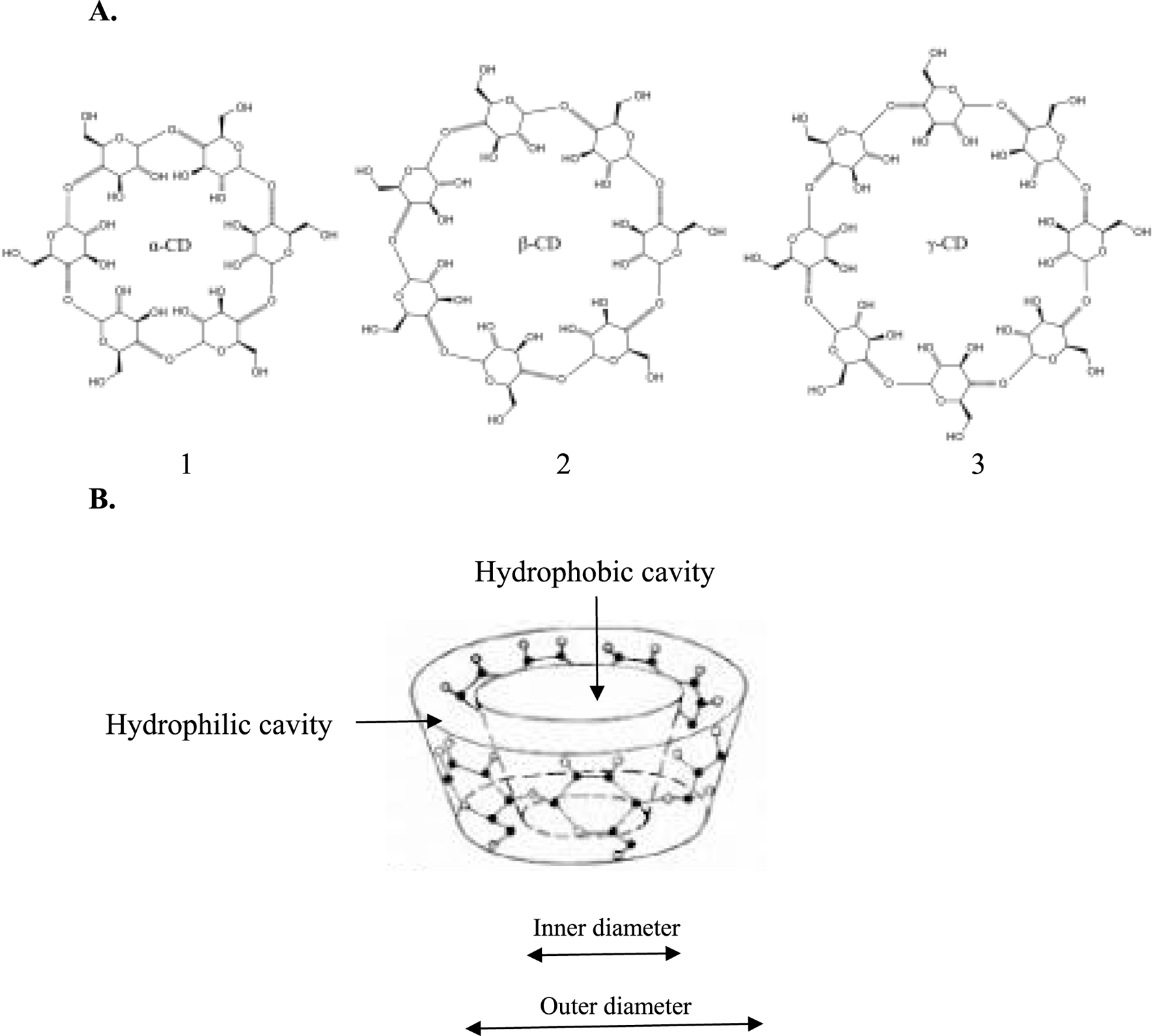 Structures of the most common cyclodextrins (CyDs) to enhance the bioavailability of poorly water-soluble bioactives. 1. α-cyclodextrin; 2. β-cyclodextrin; and 3. γ-cyclodextrin (Sharma and Baldi, 2016). (A) 2D structures; (B) 3D toroidal structure of CyDs.