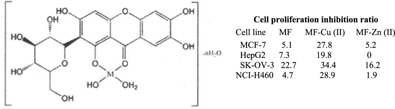 Qin et al. (2016) have reported the synthesis of MF-Cu (II) and MF-Zn (II) complexes in a 1:1 stoichiometric ratio, at pH 7.5, and proposed the structure shown in Figure 9 according to the spectral data. MF was attached to the metal nucleus through the electron pair of the oxygen atom in the carbonyl group and the hydroxyl group in C1. MF-metal complexes were tested through the MTT test on breast (MCF-7), liver (HepG2), ovarian (SKOV 3), and lung (NCI-H460) cancer cell lines. Inhibition of cell proliferation was enhanced between 1.6-fold and 6.1-fold, as compared to MF. MF-Cu (II) complex showed the best inhibition number for MCF-7 and NCI-H460 cancer cell lines, and the poorest for SKOV3 cell line. The MF-Zn (II) complex did not show a significant improvement in cell proliferation as compared to MF.