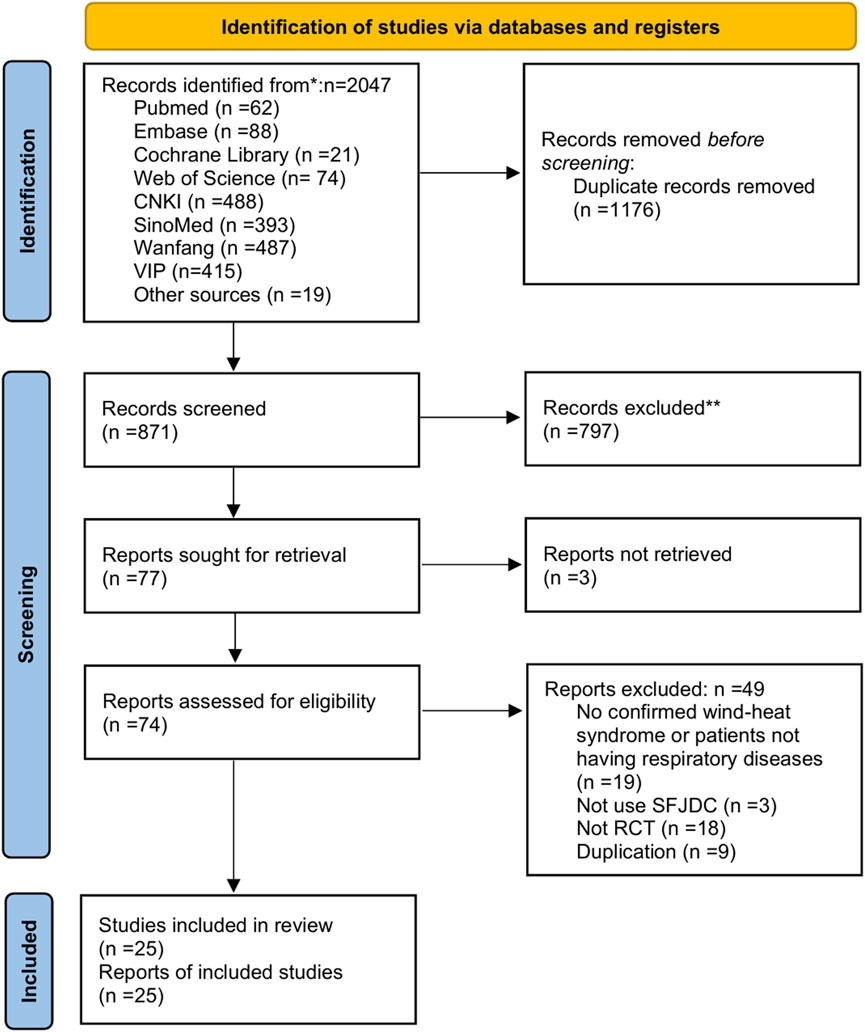 The initial search identified 2047 articles. After removing 1176 duplicates, 871 articles remained. Screening of titles and abstracts led to the exclusion of 797 articles, leaving 77 for full-text review. Three reports could not be retrieved and were excluded. Of the remaining 74 articles, 49 were excluded for the following reasons: Population: 19 studies lacked confirmed wind-heat syndrome diagnosis or included non-respiratory disease patients. Intervention: 3 studies did not use Shufeng Jiedu Capsules as the primary intervention. Study design: 18 were non-randomized controlled trials (RCTs). Duplicates: 9 were duplicate publications not detected in the initial screening. The screening process adhered strictly to predefined PICOS criteria and established inclusion/exclusion protocols. A total of 25 studies (Li, 2023; Li, 2022; Li and Zhang L. S., 2022; Zhang J. P., 2022; Chen and Zhang, 2021; Tang et al., 2021; Xia et al., 2021; Fei et al., 2020; Pan et al., 2020; Zhang and Zhang, 2020; Zhao and Wang, 2020; Wang and Zhao, 2020; Shen, 2021; Yang et al., 2019; He, 2019; Zhou et al., 2019; Wu et al., 2019; Chang, 2019; Li and Li, 2019; Zhu et al., 2018; Zhao C. et al., 2018; Xie, 2017; Wei et al., 2016; Han et al., 2016; Zhang et al., 2014) met the criteria and were included in the analysis. All included studies were published in Chinese. The screening process is illustrated in Figure 1.