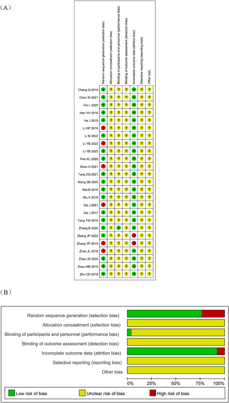 Nineteen studies reported randomization. Of these, 17 used random number tables (Li, 2023; Li, 2022; Zhang J. P., 2022; Chen and Zhang, 2021; Tang et al., 2021; Fei et al., 2020; Pan et al., 2020; Zhang and Zhang, 2020; Zhao and Wang, 2020; Wang and Zhao, 2020; Yang et al., 2019; He, 2019; Zhou et al., 2019; Chang, 2019; Xie, 2017; Wei et al., 2016; Han et al., 2016), 1 used coin tossing (Zhu et al., 2018), and 1 used random drawing (Wu et al., 2019). Six studies (Li and Zhang, 2022; Xia et al., 2021; Shen, 2021; Li and Li, 2019; Zhao J. L. et al., 2018; Zhang et al., 2014) mentioned randomization without specifying the method. None of the studies reported allocation concealment, and this was therefore rated as unclear. Only one study (Zhang and Zhang, 2020) described blinding, which was assessed as low risk; the others provided no relevant details and were rated as unclear. No study described blinding of outcome assessment, which was also rated as unclear. Two studies (Zhang J. P., 2022; Zhang et al., 2014) reported loss to follow-up and were assessed as high risk for attrition bias. None of the studies were registered in a protocol registry, so selective reporting risk was rated as unclear. Other potential sources of bias could not be determined and were rated as unclear. The detailed risk of bias assessment is shown in Figure 2. A considerable proportion of the included trials were judged to have an “unclear” risk of bias in critical domains, such as random sequence generation, allocation concealment, and blinding. The pervasive “unclear” reporting inherently limits the strength of evidence, potentially leading to an overestimation of treatment effects due to performance and selection biases.