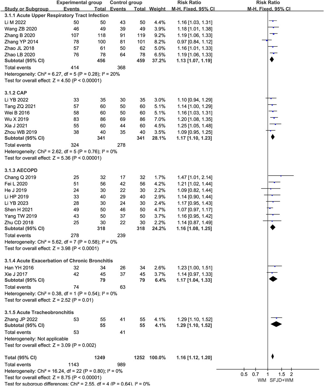 A total of 23 articles (Li, 2023; Li, 2022; Li and Zhang, 2022; Zhang J. P., 2022; Tang et al., 2021; Xia et al., 2021; Fei et al., 2020; Zhang and Zhang, 2020; Zhao and Wang, 2020; Wang and Zhao, 2020; Shen, 2021; Yang et al., 2019; He, 2019; Zhou et al., 2019; Wu et al., 2019; Chang, 2019; Li and Li, 2019; Zhu et al., 2018; Zhao C. et al., 2018; Xie, 2017; Wei et al., 2016; Han et al., 2016; Zhang et al., 2014) reported the overall clinical efficacy rate, involving 2501 patients. The heterogeneity test result was P = 0.73 and I2 = 0%. As there was no heterogeneity, a fixed-effects model was used for the meta-analysis. The findings suggested that, compared with conventional biomedical therapy alone, Shufeng Jiedu Capsule combined with biomedical therapy may be associated with improved clinical effective rates in patients with respiratory diseases presenting with wind-heat syndrome (RR = 1.16, 95% CI 1.12 to 1.19, P < 0.00001). Given the low certainty of evidence, these findings require verification in high-quality studies. Subgroup analysis by respiratory disease type yielded results consistent with the overall findings and showed low heterogeneity (Figure 3). Sensitivity analysis confirmed the robustness and reliability of the conclusions (Supplementary Figure S11A).