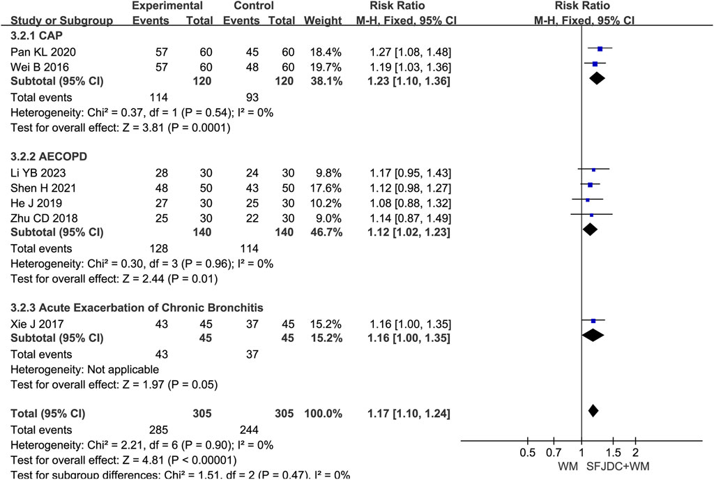 Seven articles (Li, 2023; Pan et al., 2020; Shen, 2021; He, 2019; Zhu et al., 2018; Xie, 2017; Wei et al., 2016) involving 610 patients reported the effective rate of TCM syndromes using unified reference standards (National Medical Products Administration, 2002). The heterogeneity test result was P = 0.90 and I2 = 0%. A fixed-effects model was therefore applied. Compared with conventional biomedical therapy alone, Shufeng Jiedu Capsule combined with biomedical therapy appeared to improve the effective rate of TCM syndromes in patients with respiratory diseases and wind-heat syndrome (RR = 1.17, 95% CI 1.10 to 1.24, P < 0.00001). Sensitivity analysis confirmed the robustness and reliability of the conclusions (Supplementary Figure S11B). Subgroup analysis by respiratory disease type produced results consistent with the overall analysis and showed no heterogeneity (Figure 4).