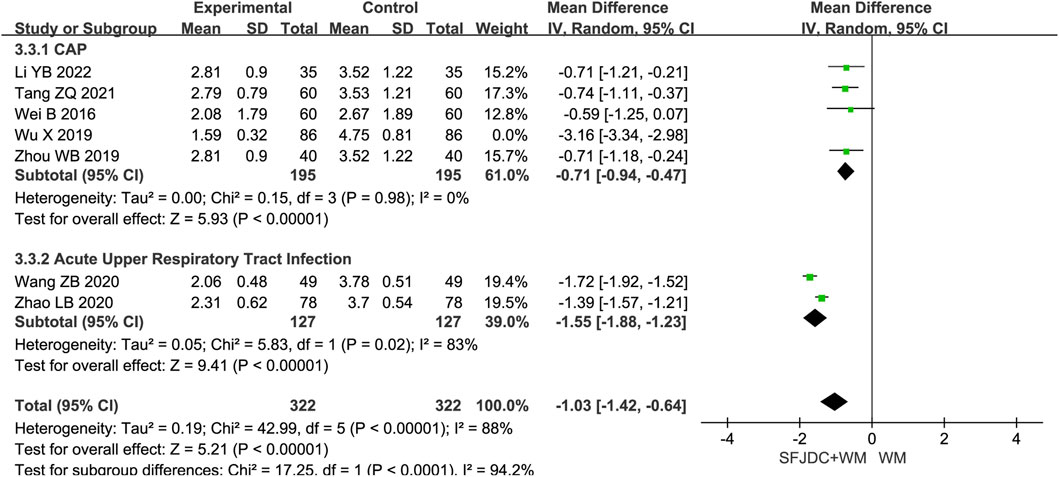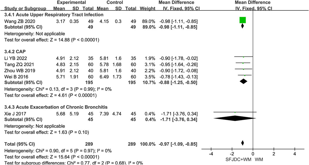 Six articles (Li and Zhang, 2022; Tang et al., 2021; Wang and Zhao, 2020; Wei et al., 2016), involving 578 patients, reported the resolution time of cough. The heterogeneity test result was P = 0.97, I2 = 0%. A fixed-effects model was applied. Compared with conventional biomedical therapy alone, Shufeng Jiedu Capsule combined with biomedical therapy significantly reduced cough resolution time in patients with respiratory diseases and wind-heat syndrome (MD = −0.97, 95% CI -1.09 to −0.85, P < 0.00001). Sensitivity analysis confirmed the robustness of the results (Supplementary Figure S11C). Subgroup analysis by disease type showed inconsistent results for the AECB group; however, this subgroup was based on a single study, and confirmation in large multicenter trials is needed (Figure 6).