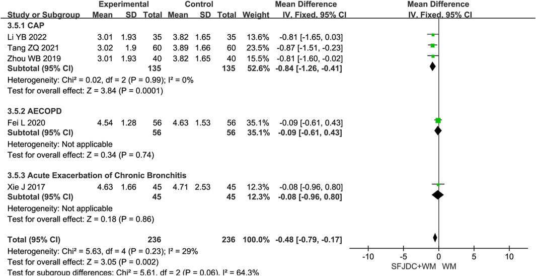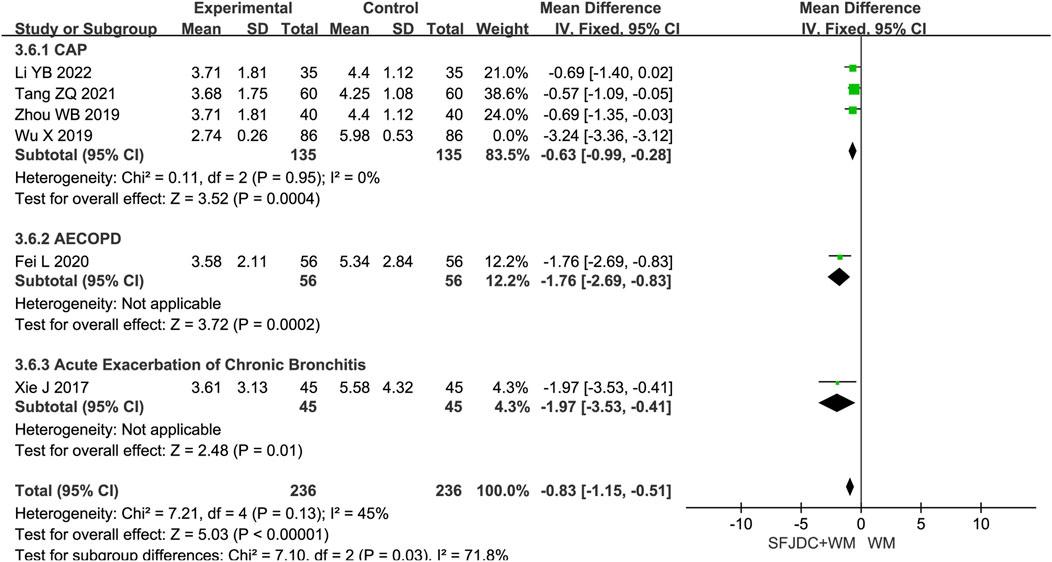 Five articles (Li and Zhang, 2022; Tang et al., 2021; Fei et al., 2020; Zhou et al., 2019; Xie, 2017), involving 472 patients, reported the resolution time of phlegm. The heterogeneity test result was P = 0.23 and I2 = 29%. As heterogeneity was low, a fixed-effects model was used. The findings indicated that, compared with conventional biomedical therapy alone, Shufeng Jiedu Capsule combined with biomedical therapy shortened phlegm resolution time in patients with respiratory diseases and wind-heat syndrome (MD = −0.48, 95% CI -0.96 to −0.17, P = 0.002). Sensitivity analysis confirmed result stability (Supplementary Figure S11D). Subgroup analysis by disease type showed consistent results with no heterogeneity for the CAP subgroup. However, the AECOPD and AECB subgroups had results inconsistent with the overall findings. Both subgroups were based on single studies, and further large-scale multicenter research is needed (Figure 7).