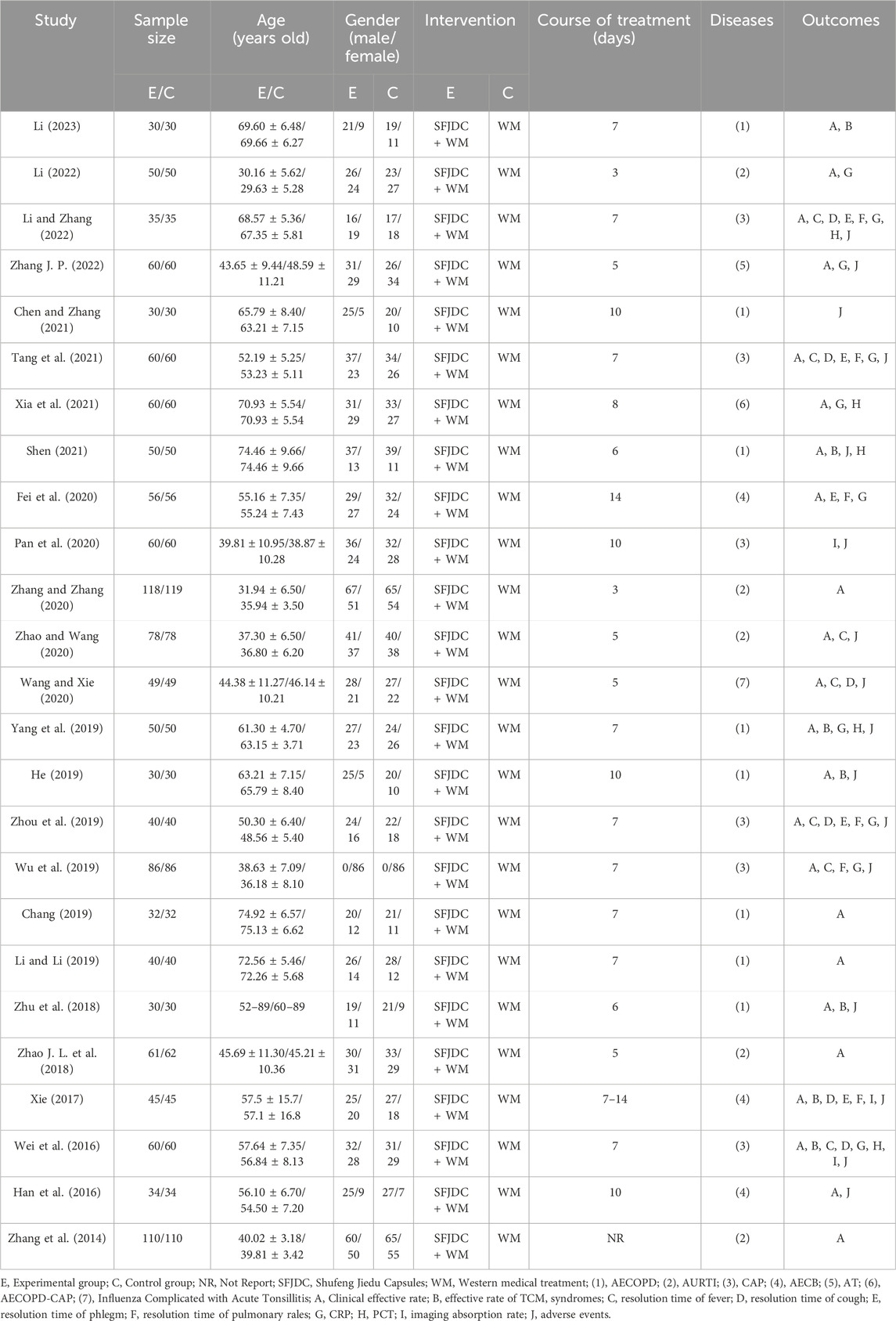 The 25 included studies involved 2681 patients, with 1339 in the experimental group and 1342 in the control group. All studies addressed wind-heat syndrome or wind-heat invading lung syndrome. The disease distribution was as follows: six studies (Li, 2022; Zhang and Zhang, 2020; Zhao and Wang, 2020; Wang and Zhao, 2020; Zhao J. L. et al., 2018; Zhang et al., 2014) on acute upper respiratory tract infections, seven on CAP (Li and Zhang, 2022; Tang et al., 2021; Xia et al., 2021; Pan et al., 2020; Zhou et al., 2019; Wu et al., 2019; Wei et al., 2016), 9 on AECOPD (Li, 2023; Chen and Zhang, 2021; Fei et al., 2020; Shen, 2021; Yang et al., 2019; He, 2019; Chang, 2019; Li and Li, 2019; Zhu et al., 2018), two on acute exacerbations of chronic bronchitis (AECB) (Xie, 2017; Han et al., 2016), and 1 on acute tracheobronchitis (Zhang J. P., 2022). In all trials, the experimental group received Shufeng Jiedu Capsules combined with biomedicine. The control group received biomedicine alone. Biomedical interventions mainly consisted of symptomatic and supportive treatments, including anti-infective therapy, cough relief, and phlegm reduction. The basic characteristics of the included studies are presented in Table 1.