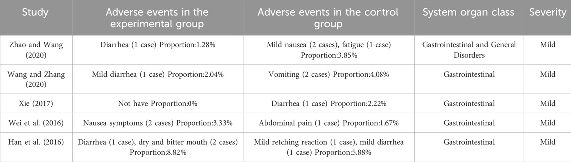 Sixteen articles (Li and Zhang, 2022; Zhang J. P., 2022; Chen and Zhang, 2021; Tang et al., 2021; Pan et al., 2020; Zhao and Wang, 2020; Wang and Zhao, 2020; Shen, 2021; Yang et al., 2019; He, 2019; Zhou et al., 2019; Wu et al., 2019; Zhu et al., 2018; Xie, 2017; Wei et al., 2016; Han et al., 2016), involving 1474 patients, reported adverse event incidence rates. The heterogeneity test indicated P = 0.80 and I2 = 0%. As no heterogeneity was detected, a fixed-effects model was used. Compared with biomedical therapy alone, the combination of Shufeng Jiedu Capsule and biomedical therapy showed no statistically significant difference in adverse event incidence (RR = 0.88, 95% CI 0.34 to 2.31, P = 0.80). Sensitivity analysis confirmed the robustness and reliability of the conclusions (Supplementary Figure S11H). Subgroup analysis by respiratory disease type yielded results consistent with the overall meta-analysis (Supplementary Figure S10). Adverse events were mainly gastrointestinal, and all were mild, and no serious adverse events were reported. No studies reported any significant drug-drug interactions. Detailed descriptive statistics are presented in Table 2.