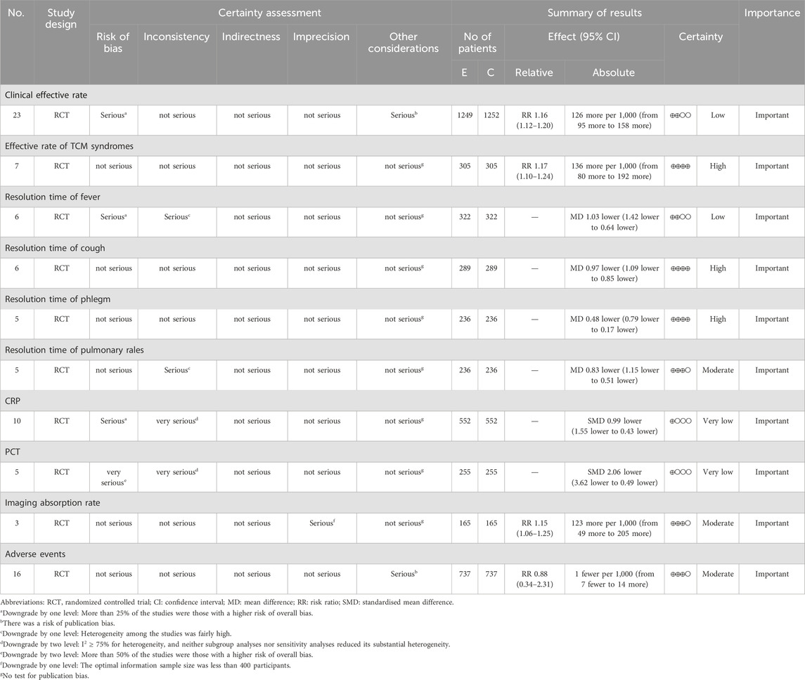 The GRADE approach was applied to assess the quality of evidence for 10 outcome indicators (Table 3). The results showed high-quality evidence for the effective rate of TCM syndromes, resolution time of cough, and resolution time of phlegm. Moderate-quality evidence was found for the resolution time of pulmonary rales, imaging absorption rate, and adverse events; low-quality evidence for the clinical effective rate and resolution time of fever; and very low-quality evidence for CRP and PCT. The main reasons for downgrading evidence quality included poor methodological quality of the included RCTs, substantial heterogeneity, small sample sizes, and potential publication bias.