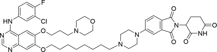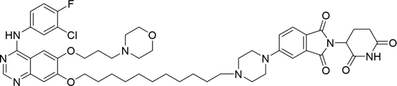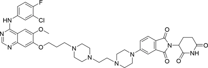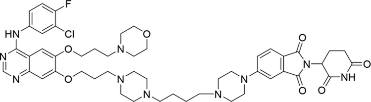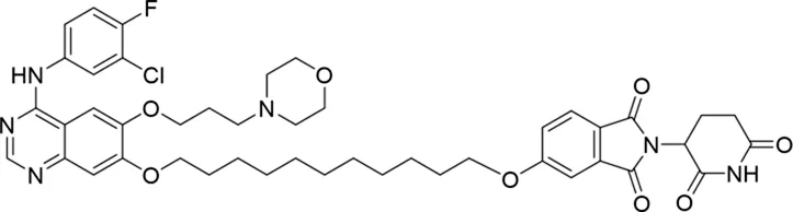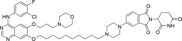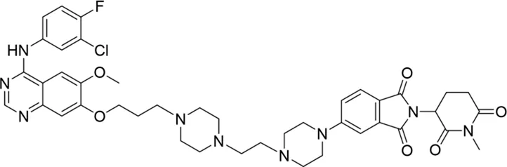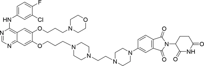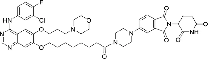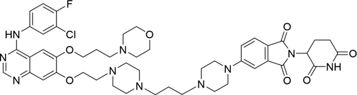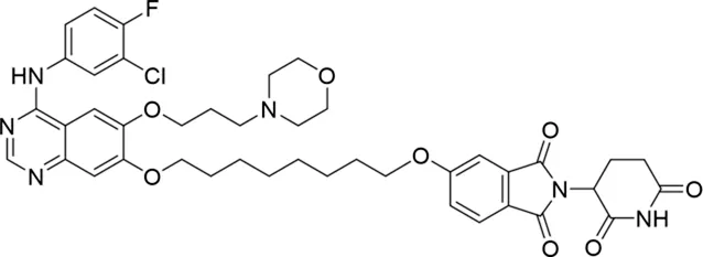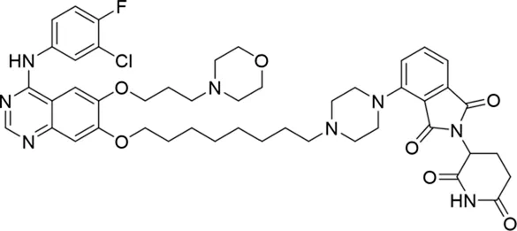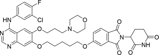 Recently, proteolysis-targeting chimeras (PROTACs) have emerged as a promising modality for targeted protein degradation (TPD) via the ubiquitin–proteasome system (UPS). PROTACs are hetero-bifunctional molecules that are composed of a ligand for targeting the protein of interest (POI), an E3 ubiquitin ligase ligand, and a linker connecting these two ligands (Bekes et al., 2022). Different from traditional inhibitors based on occupancy-driven pharmacology, PROTACs induce protein degradation through an event-driven mechanism and are considered capable of therapeutically targeting a broad range of intractable proteins (Lai and Crews, 2017). Proteins that have evolved resistance mutations to targeted therapies are considered suitable PROTAC targets, and the design of specific PROTAC molecules against mutant EGFR proteins in EGFR mutant-driven NSCLC may be a promising strategy to eradicate the occurrence of secondary mutations.