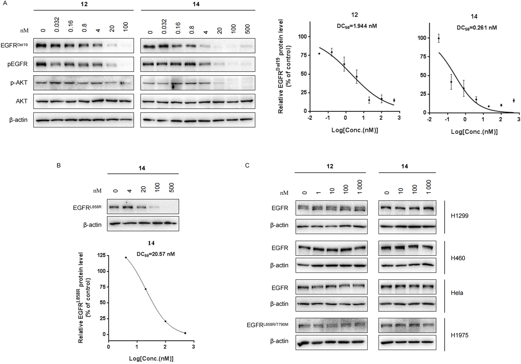 (A) Western blots of EGFRDel19, pEGFR, AKT, and pAKT in HCC827 cells with compound 12 or 14 for 24 h. The DC50 values were calculated using GraphPad Prism. (B) Western blots in Ba/F3 cells stably expressing the EGFRL858R mutant with compound 14 for 24 h. (C) Immunoblots of EGFR in H1299, H460, HeLa, and H1975 cells treated with compound 12 or 14 for 24 h.