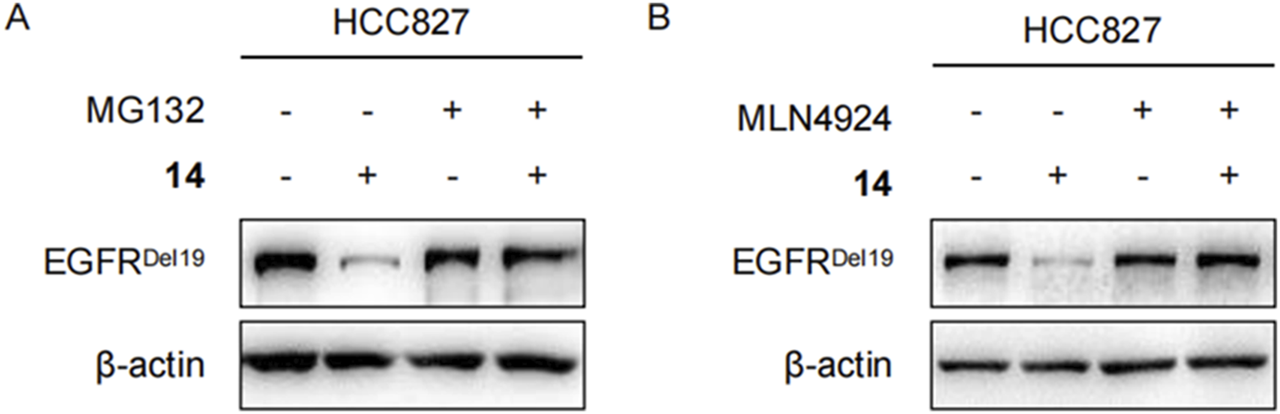 To clarify whether these degradations were dependent on E3 ligase complex recruitment, HCC827 cells were pretreated with either the proteasome inhibitor MG132 or the NEDD8-activating enzyme inhibitor MLN4924 for 2 h and continuously incubated with compound 14 for an additional 8 h. As shown in Figures 5A,B, both MG132 and MLN4924 restored EGFRDel19 degradation induced by compound 14, implying that EGFR degradation by compound 14 was dependent on the ubiquitination and neddylation system.