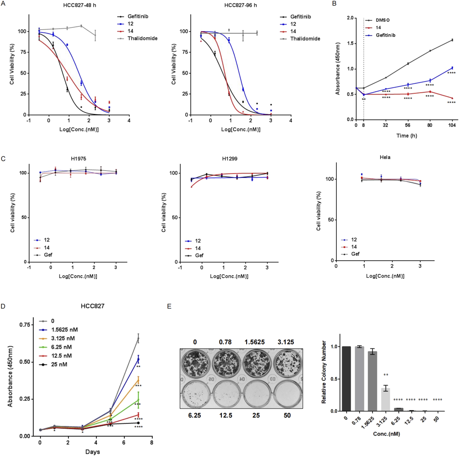 Compound 14 effectively inhibited cell viability of HCC827. (A) HCC827 cells were treated with various concentrations of compound 12, compound 14, gefitinib, or thalidomide for 48 h (left panel) or 96 h (right panel). (B) HCC827 cells were pretreated with compound 14 or gefitinib at 10 nM for 8 h, rinsed with PBS, and cultured for additional indicated times (24 h, 48 h, 72 h, and 96 h). Cell proliferation was measured using CCK-8. (C) H1975, H1299, and HeLa cells were treated with compound 12, compound 14, or gefitinib for 96 h. Proliferation (D) and colony-forming abilities (E) of HCC827 cells with different concentrations of compound 14 were examined. Results are presented as the mean ± SD of three independent experiments. p-values were calculated using the Student’s t-test (*p < 0.05; **p < 0.01; ***p < 0.001; ****p < 0.0001)
