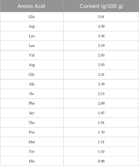 To characterize SCSP, we first quantified its yield following enzymatic hydrolysis. After 4 h of hydrolysis, SCSP yield reached 12.2% of the input snow crab shells, significantly higher than the chitin content (6.42%). Molecular weight distribution analysis revealed that the 5,000-10,000 Da fraction constituted the highest proportion (47.58%), followed by the 10,000-20,000 Da fraction (27.56%) (Table 3). These findings indicate that SCSP predominantly consists of low-to medium-molecular-weight peptides, a property potentially linked to its functional stability and biological activity. Amino acid composition analysis (Table 4) showed that glutamic acid (Glu) was the most abundant (5.91 g/100 g), followed by aspartic acid (Asp, 4.59 g/100 g) and lysine (Lys, 3.36 g/100 g). Essential amino acids (EAA) constituted 39.21% of the total, while non-essential amino acids (NEAA) accounted for 60.78%. The presence of both EAA and NEAA, particularly the enrichment in Glu, Asp, and Lys, suggests that SCSP may possess substantial bioactive benefits, such as promoting bone health.