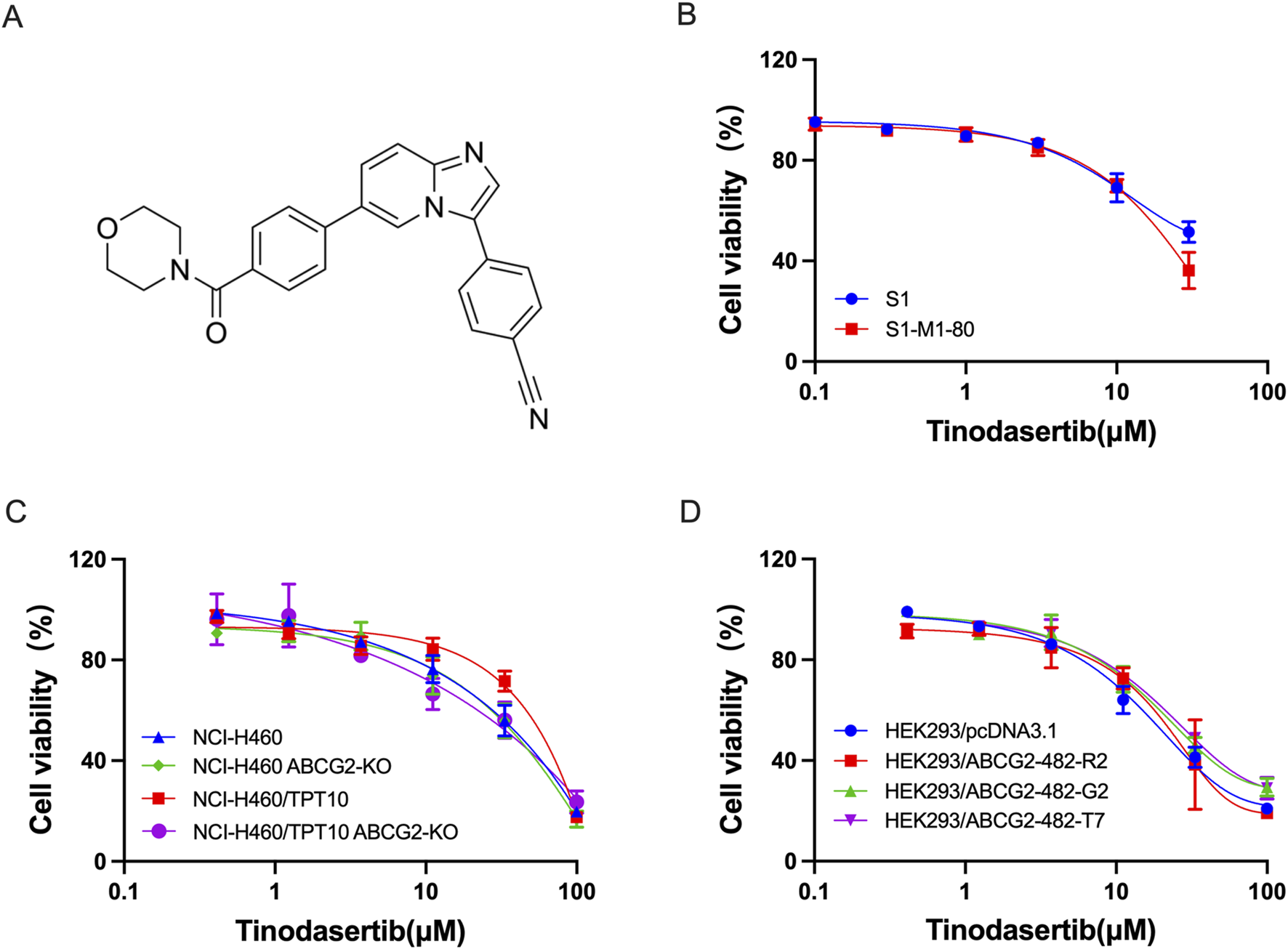 Figure 1. The impact of tinodasertib on the survival of both parental and ABCG2-overexpressing cell lines. (A) Tinodasertib’s chemical structure. (B) Viability curves for colon cancer cell lines S1 and S1-M1-80. (C) Viability curves for non-small cell lung cancer lines, including NCI-H460 and NCI-H460/TPT10, as well as NCI-H460 ABCG2-KO and NCI-H460/TPT10 ABCG2-KO cancer cells (D) Viability curves for HEK293 cells and HEK293/ABCG2-overexpressing cells.