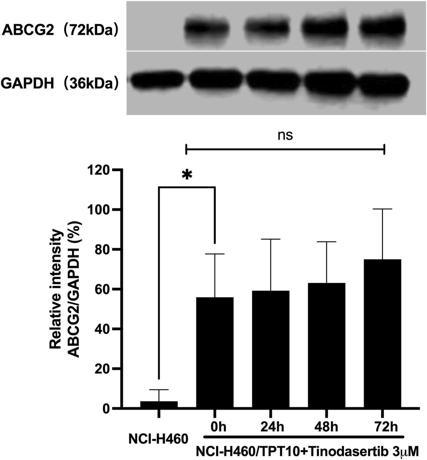 Figure 2. Tinodasertib showed no impact on the protein expression levels of ABCG2 transporters.The detection and relative intensity of ABCG2 expression in NCI-H460/TPT10 cells treated with 3 μM tinodasertib over the specified time points are presented as mean ± SD and are representative of three independent experiments. *P < 0.05 compared to the control group (NCI-H460).