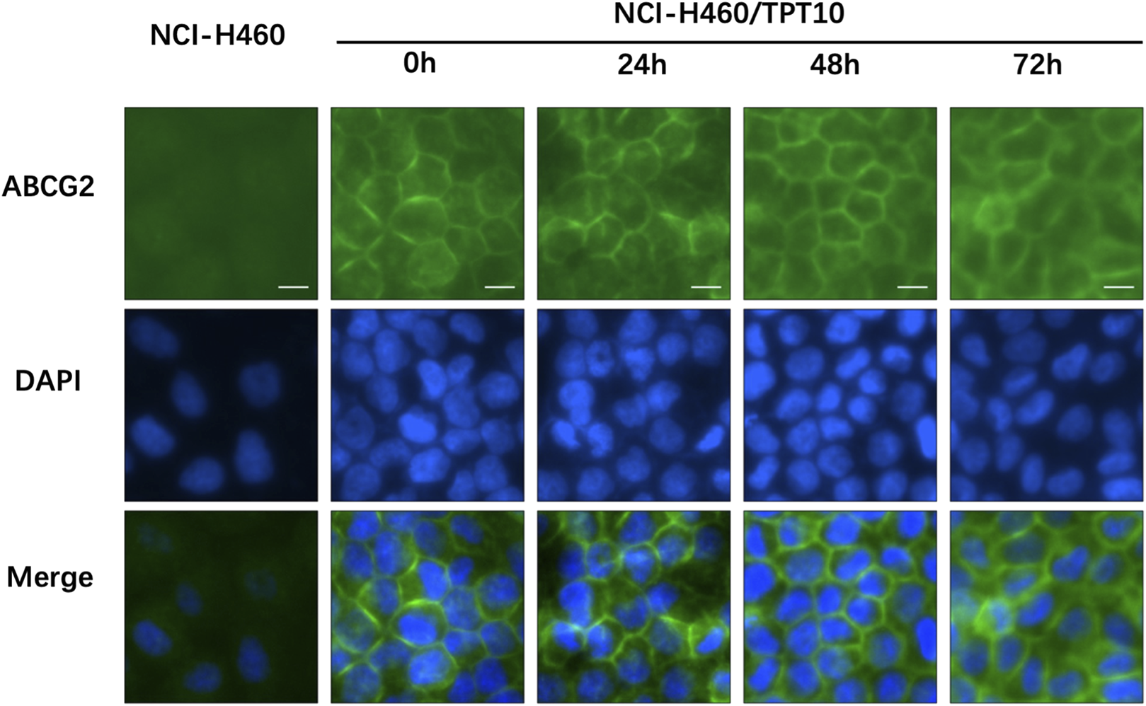 Figure 3. Tinodasertib treatment had no impact on the subcellular localization of ABCG2 transporters in the NCI-H460/TPT10 cell line overexpressing ABCG2. The subcellular distribution of ABCG2 in NCI-H460/TPT10 cells treated with 3 μM tinodasertib for 0, 24, 48, and 72 h is shown. ABCG2 is visualized in blue, while DAPI was used to counterstain the nuclei. NCI-H460 cells served as the control group. Scale bar: 100 μm.