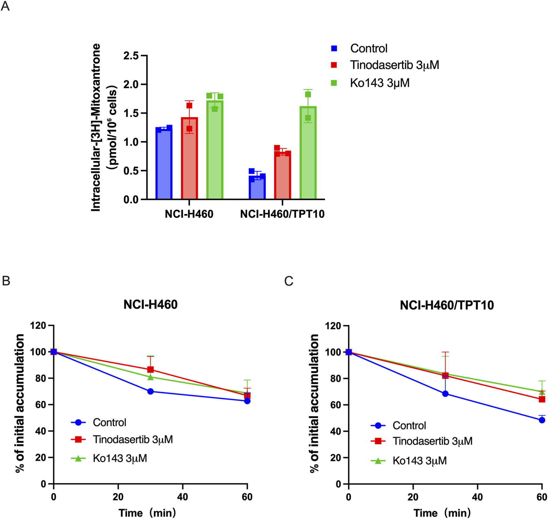 Figure 4. Tinodasertib enhances drug accumulation and suppresses ABCG2-mediated efflux activity in cancer cell lines that overexpress ABCG2. (A) The impact of tinodasertib on [3H]-mitoxantrone accumulation was examined in NCI-H460 and NCI-H460/TPT10 cell lines. Ko143 (3 μM) served as a positive control for cells overexpressing ABCG2. (B, C) The impact of tinodasertib on [3H]-mitoxantrone efflux was assessed in NCI-H460 (B) and NCI-H460/TPT10 (C) cell lines. The data, presented as mean ± SD, represent the outcomes of three separate experiments. *p < 0.05 compared to the control group.