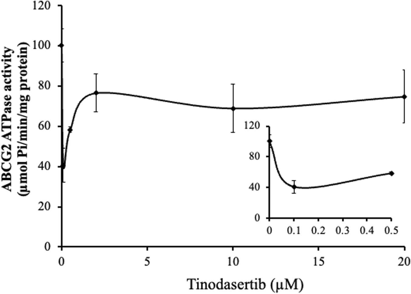Figure 5. Tinodasertib suppressed the ABCG2-associated ATPase activity. The effect of varying tinodasertib concentrations on ABCG2 ATPase activity is illustrated. The inset graphs highlight the influence of 0–20 μM tinodasertib on ATPase activity associated with ABCG2. Results are expressed as mean ± SD and are representative of three separate experiments.