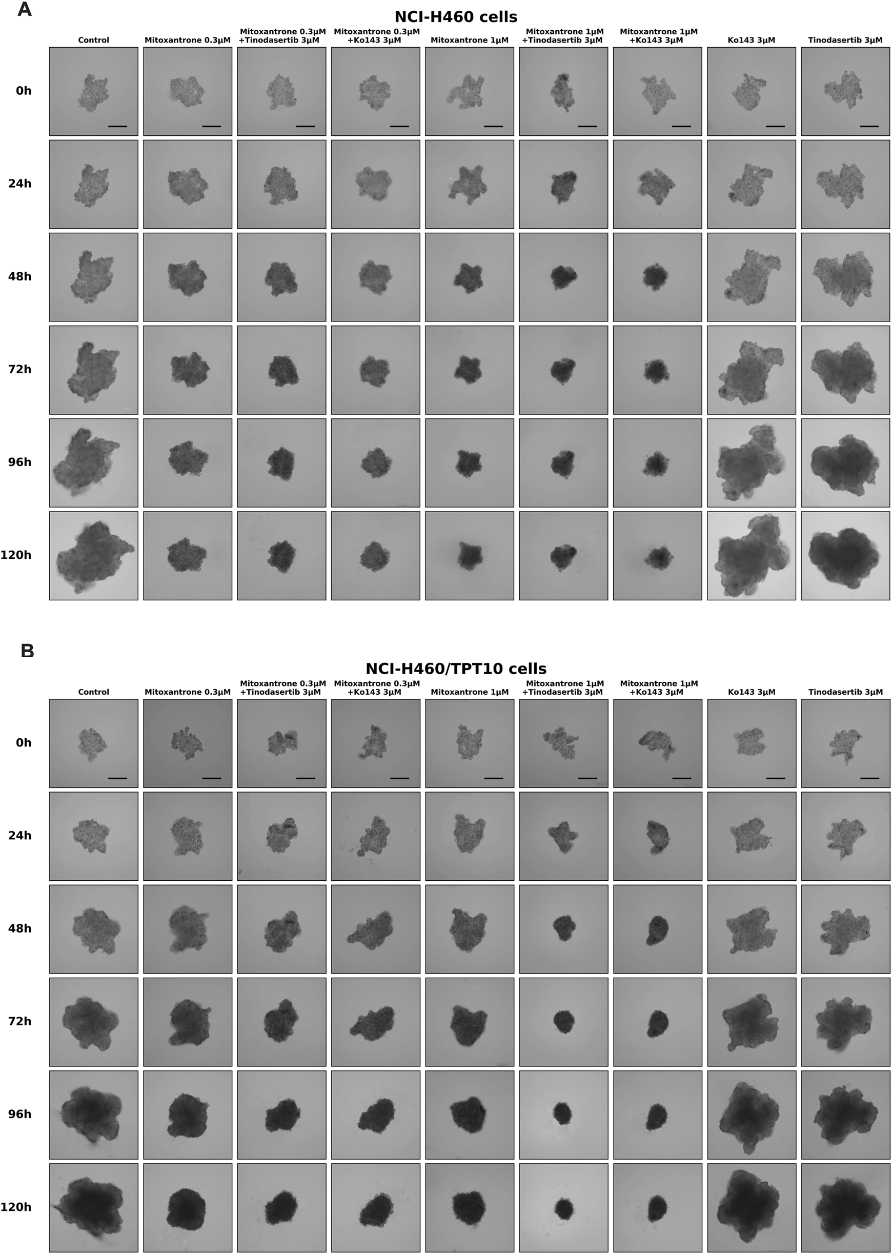 Figure 6. Sample images of multicellular tumor spheroids (MCTSs) derived from NCI-H460 and NCI-H460/TPT10 cells under various treatment conditions. (A) Representative images of MCTSs from NCI-H460 cells. (B) Representative images of MCTSs from NCI-H460/TPT10 cells. Evaluations were conducted at 0, 24, 48, 72, 96, and 120 h, with scale bars indicating 250 μm.