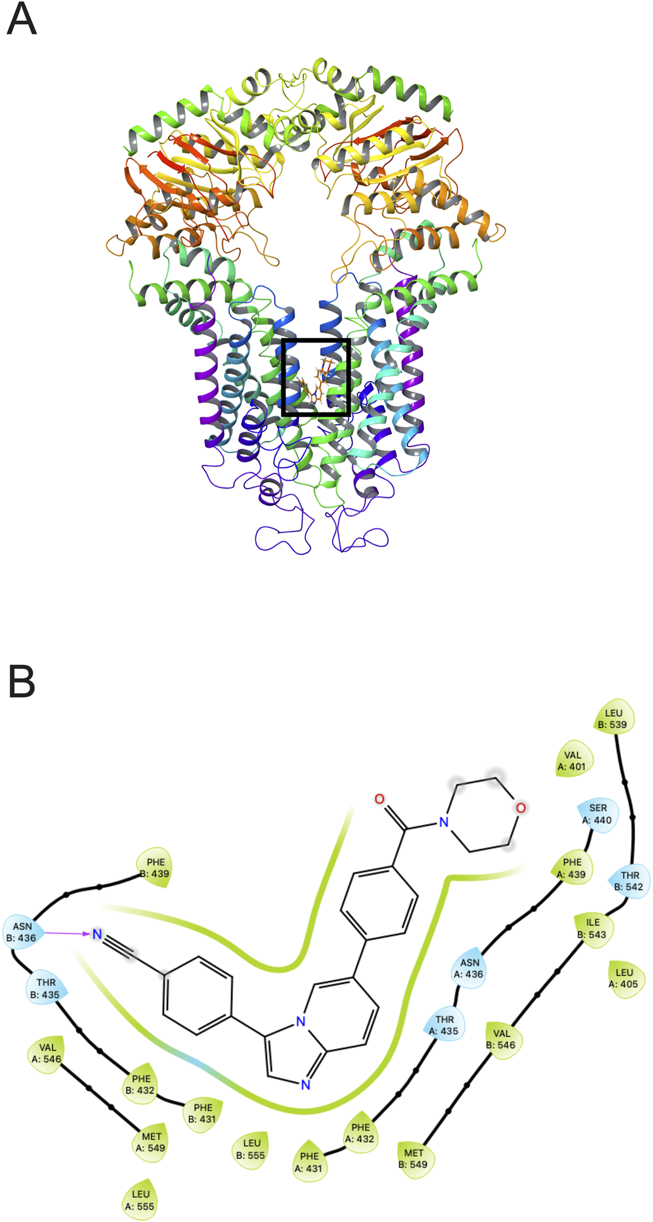 Figure 7. Tinodasertib’s interaction with the human ABCG2 protein (PDB ID: 6ETI). (A) The highest-scoring pose of tinodasertib within the drug-binding pocket of the ABCG2 protein is depicted. The ABCG2 structure is shown as tubes and ribbons in various colors, while tinodasertib is illustrated as colored sticks (carbon: grey; oxygen: red; nitrogen: blue). (B) A two-dimensional representation illustrates the interactions between tinodasertib and the drug-binding pocket of ABCG2. Significant residues are depicted as color-coded bubbles, with hydrophobic residues in green and polar ones in blue. Critical hydrogen bonds are indicated by purple dashed lines, while π-π stacking interactions are marked with green lines. Direct interactions between tinodasertib and residues like ASN436 and THR435 emphasize its binding mechanism.