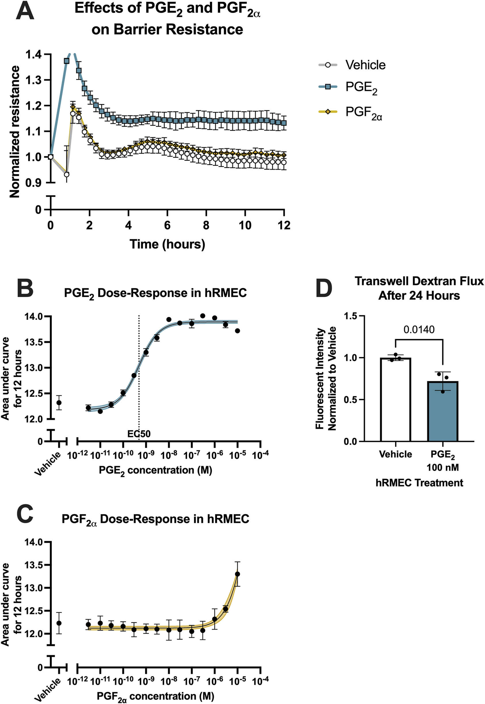 PGE2, but not PGF2α, strengthens hRMEC barrier function. (A) Normalized resistance ECIS results of hRMEC stimulated with 100 nM PGE2, 100 nM PGF2α, or vehicle over 12 h (n = 8–16, passage 8). (B) Dose-response curve of hRMEC stimulation with 3 pM–10 μM PGE2 or vehicle over 12 h (n = 6–12, passage 8). (C) Dose-response curve of hRMEC stimulation with 3 pM–10 μM PGF2α or vehicle over 12 h (n = 6-8, passage 8). (D) Transwell dextran flux across hRMEC stimulated with 100 nM PGE2 or vehicle after 24 h (n = 3, passage 8). All data represent mean ± SD shown by error bars. 1B-C were analyzed using three-parameter nonlinear regression models with the 95% confidence intervals shown. 1D was analyzed using an unpaired T-test with the P-value shown.