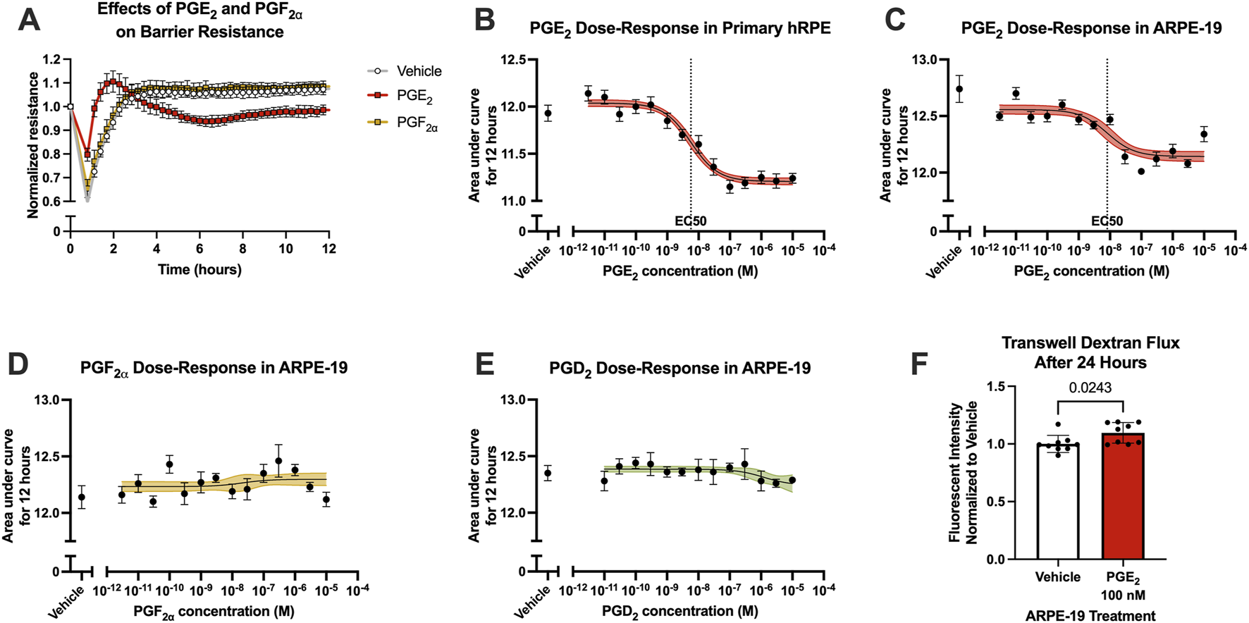 PGE2, but not PGF2α, induces RPE barrier permeability. (A) Normalized resistance ECIS results of hRPE stimulated with 100 nM PGE2, 100 nM PGF2α, or vehicle over 12 h (n = 6, passage 5). (B) Dose-response curve of hRPE stimulation with 3 pM–10 μM PGE2 or vehicle over 12 h (n = 6-9, passage 5). (C) Dose-response curve of ARPE-19 stimulation with 3 pM–10 μM PGE2 or vehicle over 12 h (n = 5–11, passage 24). (D) Dose-response curve of ARPE-19 stimulation with 3 pM–10 μM PGF2α or vehicle over 12 h (n = 6-9, passage 24). (E) Dose-response curve of ARPE-19 stimulation with 3 pM–10 μM PGD2 or vehicle over 12 h (n = 4-6, passage 24). (F) Transwell dextran flux across ARPE-19 stimulated with 100 nM PGE2 or vehicle after 24 h (n = 9, passage 24). All data represent mean ± SD shown by error bars. 4B-E were analyzed using three-parameter nonlinear regression models with the 95% confidence intervals shown. 4F was analyzed using an unpaired T-test with the P-value shown.