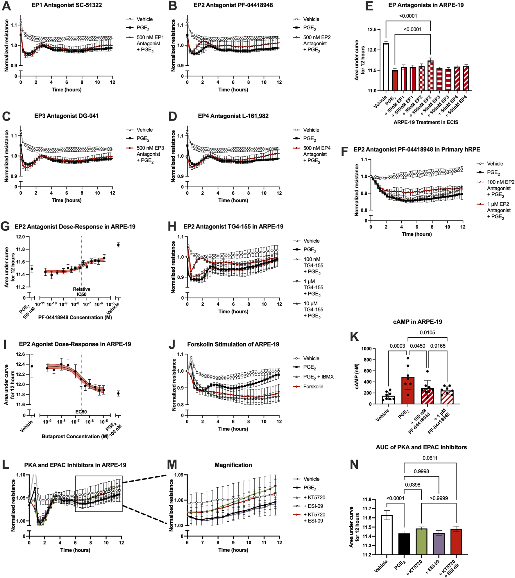 PGE2-induced barrier permeability of ARPE-19 is mediated in part by the EP2 receptor. Normalized resistance ECIS results of ARPE-19 pretreated with (A) 500 nM SC-51322, (B) 500 nM PF-04418948, (C) 500 nM DG-041, (D) 500 nM L-161,982, or vehicle for 3 h followed by stimulation with 100 nM PGE2 or vehicle over 12 h (n = 4-6, passage 25). Each antagonist is separated to an individual graph for clarity. (E) ECIS results expressed as AUC over 12 h from treatment of ARPE-19 with 50 nM–500 nM of EP antagonists +100 nM PGE2 or vehicle (n = 4-6, passage 25, comparisons to 500 nM EP2 antagonist shown). (F) Normalized resistance ECIS results of hRPE pretreated with 100 nM-1 μM PF-04418948 for 3 h followed by stimulation with 100 nM PGE2 or vehicle over 12 h (n = 4-6, passage 5). (G) Dose-response curve of ARPE-19 pretreated with 30 pM-3 μM PF-04418948 or vehicle for 3 h followed by 100 nM PGE2 or vehicle stimulation over 12 h (n = 3-6, passage 24). (H) Normalized resistance ECIS results of ARPE-19 pretreated with 100 nM-10 μM TG4-155 or vehicle for 3 h followed by stimulation with 100 nM PGE2 over 12 h (n = 5-8, passage 25). (I) Dose-response curve of ARPE-19 stimulation with 1 nM–10 μM butaprost, 100 nM PGE2, or vehicle over 12 h (n = 6–10, passage 24). (J) Normalized resistance ECIS results of hRMEC pretreated with 300 μM IBMX or vehicle for 3 h followed by stimulation with 1 μM forskolin, 100 nM PGE2, or vehicle over 12 h (n = 5-6, passage 24). (K) cAMP production in ARPE-19 pretreated with 100 nM-1 μM PF-04418948 for 1 h followed by stimulation with 1 μM PGE2 or vehicle for 15 min (n = 7-8, passage 24). (L) Normalized resistance ECIS results of ARPE-19 pretreated with 1 μM KT5720, 10 μM ESI-09, 1 μM KT5720 + 10 μM ESI-09, or vehicle for 3 h followed by 100 nM PGE2 or vehicle stimulation over 12 h (n = 6, passage 24). (M) Magnification of KT5720 ± ESI-09 ECIS results from 6 to 12 h. (N) ECIS results expressed as AUC over 12 h from treatment of hRMEC ± KT5720 and ESI-09 + 10 nM PGE2 or vehicle (n = 6, passage 24). All data represent mean ± SD shown by error bars. 5E, 5K, and 5N were analyzed using one-way ANOVAs and Tukey’s multiple comparisons tests with P-values shown for relevant comparisons. 5G and 5I were analyzed using three-parameter nonlinear regression models with the 95% confidence intervals shown.