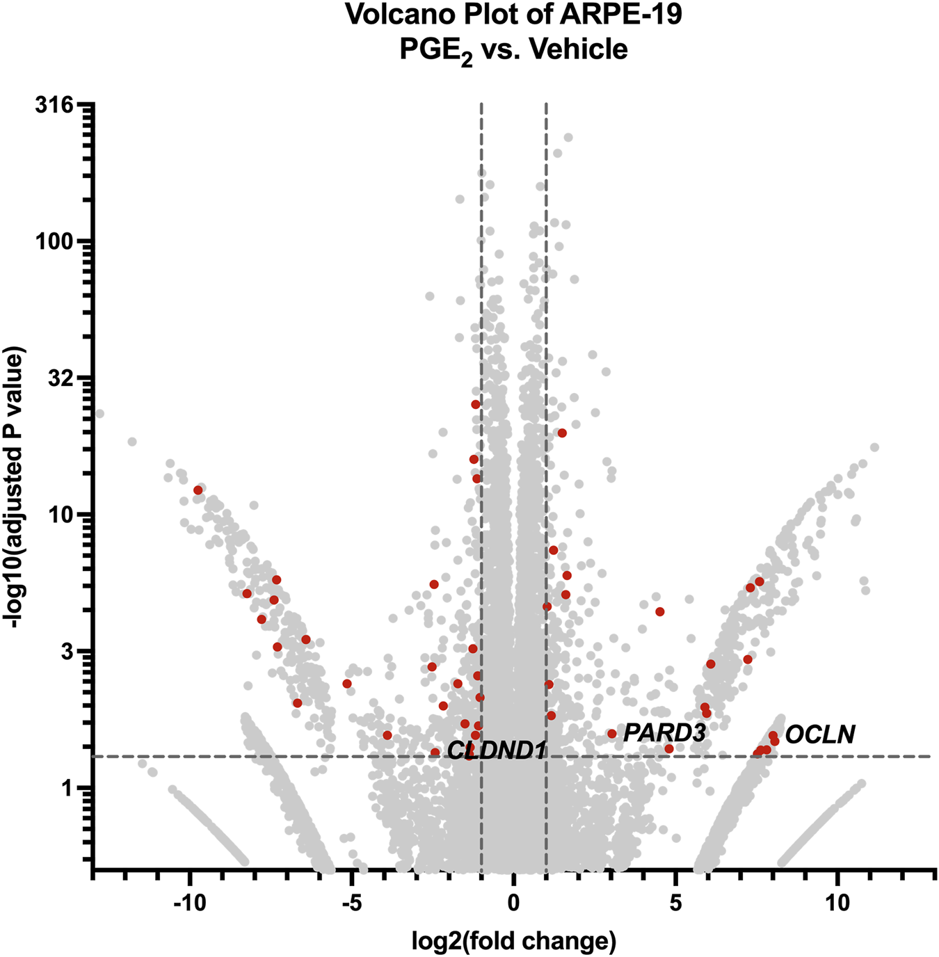 RNA-seq of ARPE-19 reveals differential gene expression after PGE2 stimulation. Volcano plot of differentially expressed genes and transcripts in ARPE-19 after 6-h stimulation with 100 nM PGE2 compared with vehicle controls. Red dots represent differentially expressed transcripts involved in tight junctions and/or cell-cell junctions. Labels to the right of dots highlight hypothesized important gene expression changes. Transcripts upregulated or downregulated by 2-fold with an adjusted P-value < 0.05 were considered significantly differentially expressed.