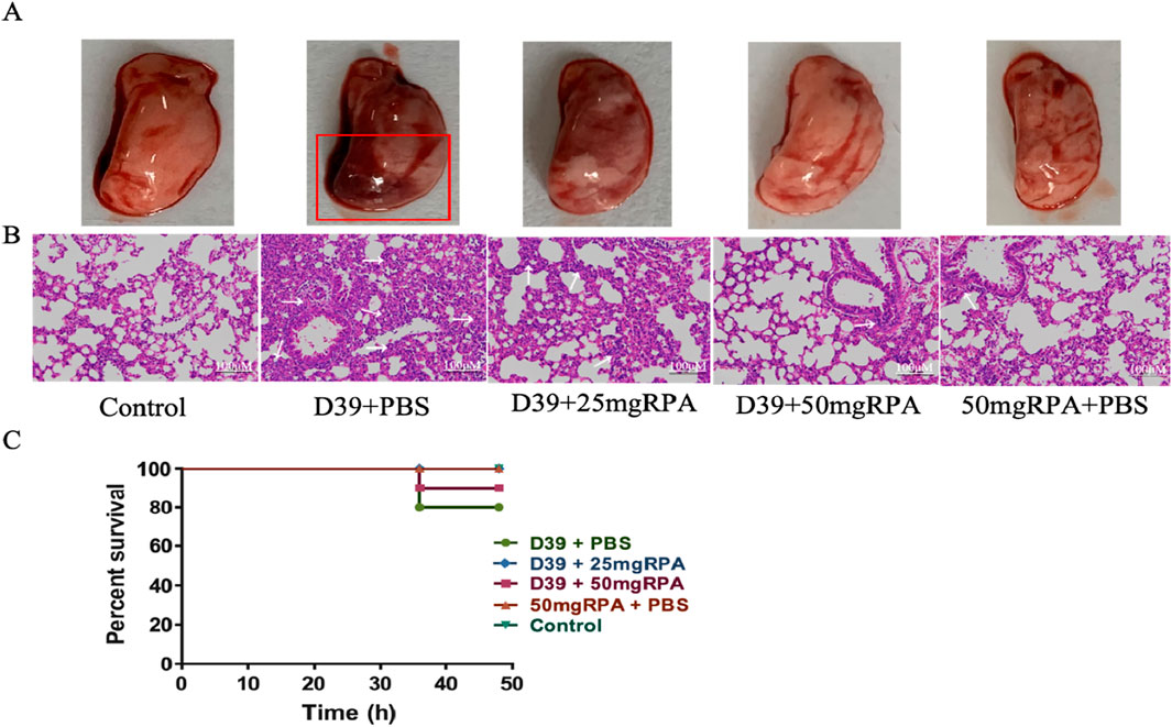 Pneumococcal D39 cells were cultured in THY medium at 37 °C to the mid-logarithmic phase (OD600 nm = 0.4), washed three times with PBS via centrifugation, and resuspended in PBS. The 50 mice were evenly divided into 5 groups: (1) the Control group (uninfected, treated with PBS); (2) the D39+PBS group (infected, treated with PBS); (3) the D39 + 25mgRPA group (infected, treated with 25 mg/kg RPA); (4) the D39 + 50mgRPA group (infected, treated with 50 mg/kg RPA); and (5) the 50mgRPA + PBS group (uninfected, treated with 50 mg/kg RPA as a drug toxicity control).