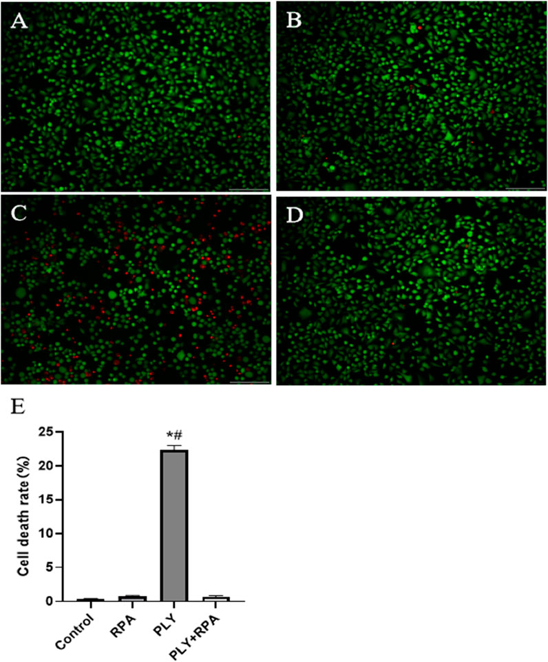 Figure 3. RPA administration reduces the PLY-mediated death of A549 cells. (A) Untreated cells, (B) cells treated with 64 μg/mL RPA, (C) cells treated with PLY, and (D) cells treated with 64 μg/mL RPA and PLY. (E) Quantitative analysis of the cell death rates in the different treatment groups. The data are presented as the means ± SDs from three independent experiments. Scale bars: 150 µm *P < 0.05 compared with the control group; #P < 0.05 compared with the PLY + RPA group. The statistical analysis was performed using one-way ANOVA followed by Tukey’s post hoc test.