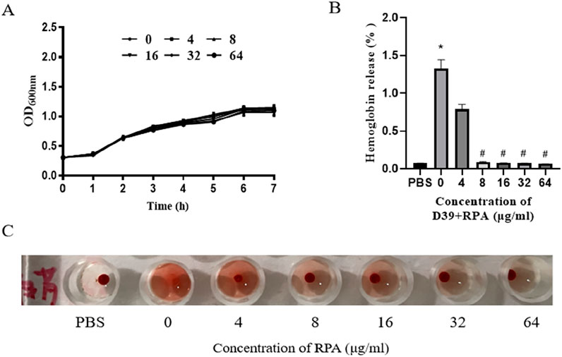 Figure 4. RPA administration does not affect the growth of S. pneumoniae but can reduce the PLY-induced hemolysis of erythrocytes. (A) Effects of different concentrations of RPA on the growth of S. pneumoniae. (B) Effects of different concentrations of RPA on the hemolysis of sheep red blood cells. (C) Macroscopic observation of the effects of different concentrations of RPA on hemolysis. The data are presented as the means ± SDs from three independent experiments. *P < 0.05 compared with the PBS group; #P < 0.05 compared with the 0 μg/mL group. Statistical significance was determined using one-way ANOVA followed by Tukey’s post hoc test.