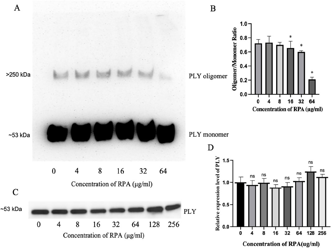 Next, we investigated whether RPA affects the production of PLY by S. pneumoniae and found that RPA did not significantly affect the production of PLY, as shown by the representative blot in Figure 5C. This finding was further confirmed by quantitative analysis, which revealed no statistically significant differences in band intensity across all the tested concentrations (Figure 5D).