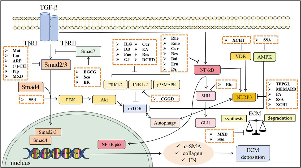 Research suggests that compound formulas and bioactive constituents derived from TCM exhibit multi-target potential against PF. Experimental studies on PF indicate that TCM demonstrate anti-fibrotic properties in preclinical models. Mechanistic studies show these agents may counteract PF by inhibiting PSCs activation, mitigating ECM accumulation, suppressing macrophage infiltration/polarization, and mitigating pancreatic acinar cells apoptosis.PSCs activation involves multiple signaling pathways, including Smad, PI3K/Akt, mitogen-activated protein kinase (MAPK), nuclear factor-κB(NF-κB), Janus tyrosine Kinase (JAK)/Signal Transducer and Activator of Transcription (STAT), and Hedgehog (Hh). Pharmacological evidence indicates that defined TCM compounds primarily modulate TGF-β/Smad, MAPK, NF-κB, and Hh pathways (Jin et al., 2020). Emerging findings suggest targeting NLRP3 inflammasome activation and autophagy modulation represents a potential strategy to inhibit PSC activation and attenuate PF progression. The following sections detail the specific molecular mechanisms by which chemically characterized TCM, including active ingredients, herbal extracts and TCM formulas, exert their anti-fibrotic effects.The schematic diagram of the relevant treatment mechanisms of TCM in PF is shown below (Figures 1, 2).