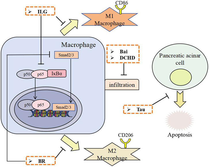 Figure 2. The anti-fibrotic effects of TCM through inhibiting macrophage infiltration and polarization, and inhibiting pancreatic acinar cell apoptosis. ILG, Isoliquiritigenin; BR, Berberine; Bai, Baicalin; Tau, Taurine; DCHD, Dachaihu decoction.